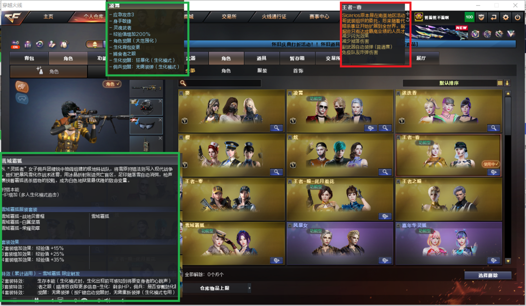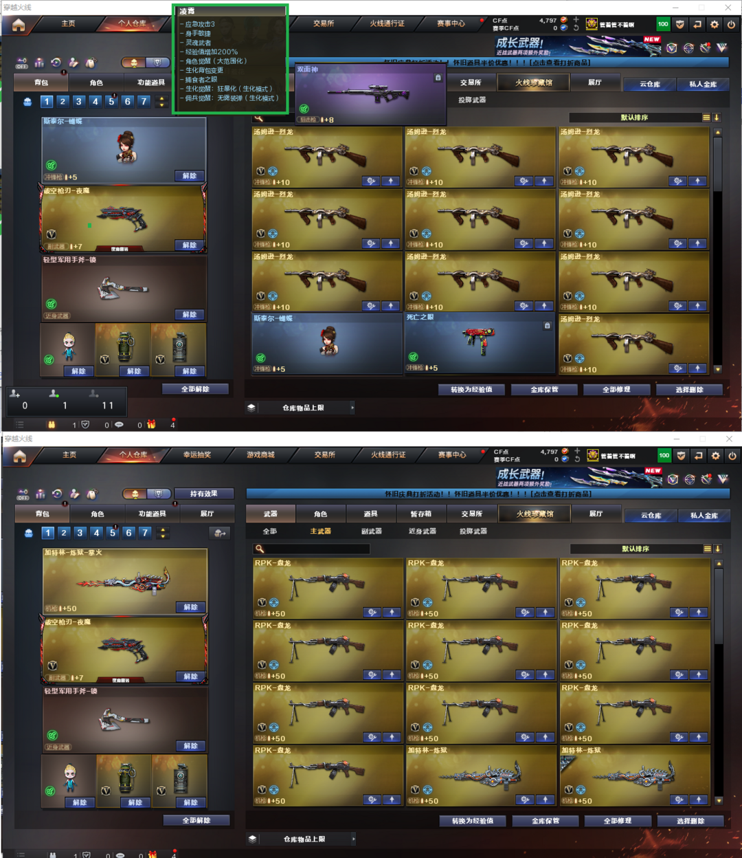 装备描述:排位:可以-----------------生化全装(生化变更背包、看僵尸血量):无需换弹、6烈龙、6盘龙、6炼狱小、斯太尔蝴蝶、双面神、死亡之眼、MAC涂鸦、手斧镜、死亡之眼、超级对讲机、、、、、、、、爆破四防:幻神、王者幻神、98K星神、USP手枪、柯尔特手枪、传说光耀、QBZ金色蔷薇、、、裁决音效、蔷薇音效、毁灭音效、雷神音效、黑龙音效、极光音效、火麒麟音效、黑骑士音效、、、2套雷霆、3套雷暴、7套夜魔、、、生化四防(凌霄、雪域霜狐)爆破四防(王者春)