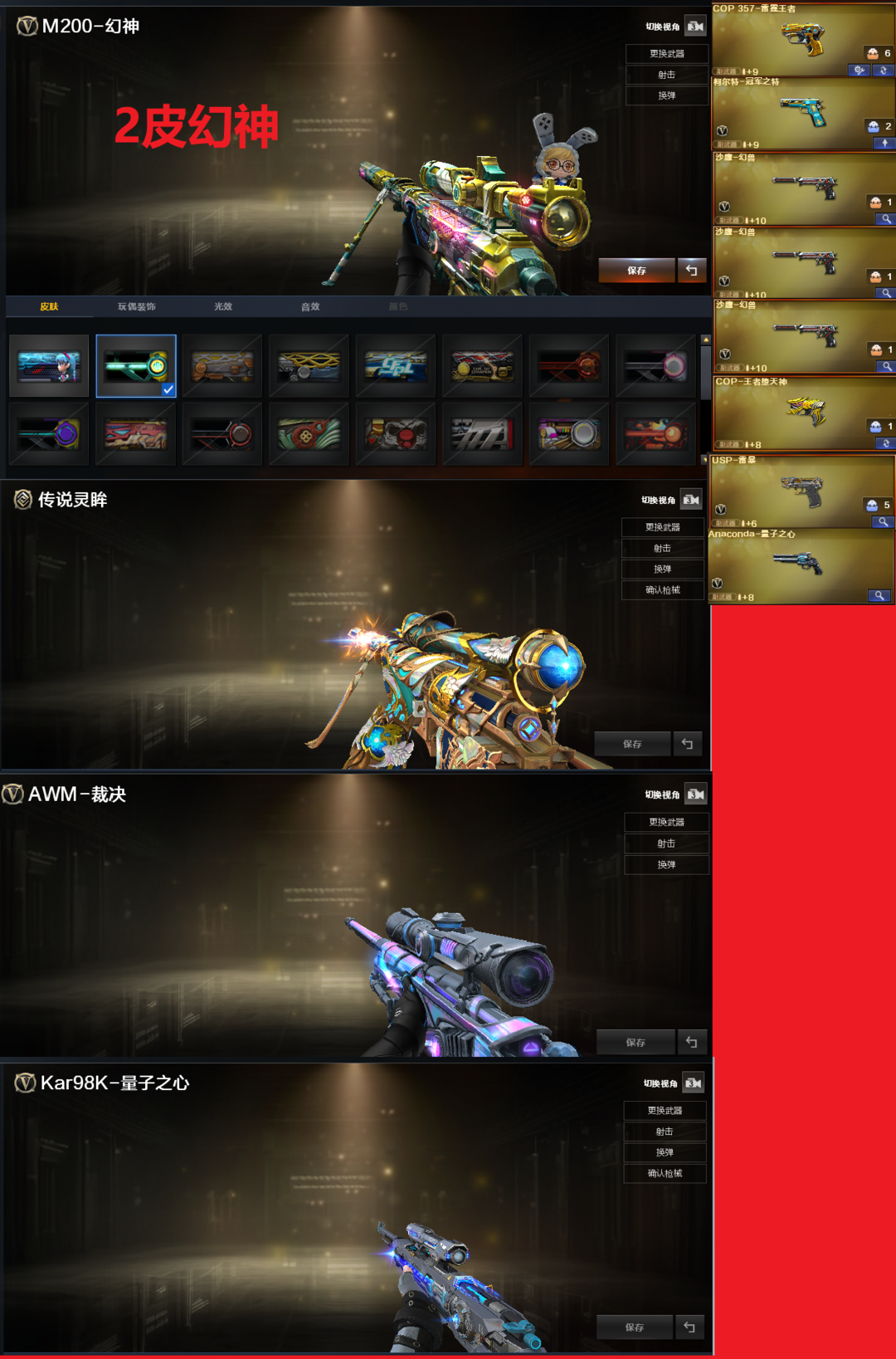 装备描述:排位:“可以、、、、、、、、、、爆破四防:幻神2皮(白鲨、青鹤皮肤)、传说灵眸、98K星神-量子之心、、、、USP雷暴、量子之心左轮、COP王者堕天神、、COP雷霆王者、冠军之特、5个幻兽沙鹰、、、、、G36幻影、QBZ幻兽、QBZ191-银翼、王者白虎、QBZ金色蔷薇、王者蔷薇、炽芒蝶刃、、、雷神音效、、、爆破四防(隼、王者春、王者闭月羞花、王者炽天使、暗夜审判)