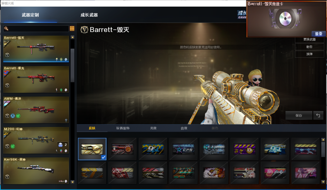 装备描述:排位:可以、、、、、、、、、、、爆破四防:幻神音效卡(周瑜皮肤)、98K星神、COP雷霆王者、柯尔特竞技荣光、G36幻影、QBZ金色蔷薇、、、1套夜魔、4套竞技荣光、1套雷霆王者、、、爆破四防(毒蝰术士、岚兮儿、王者魅影、王者晴雅)