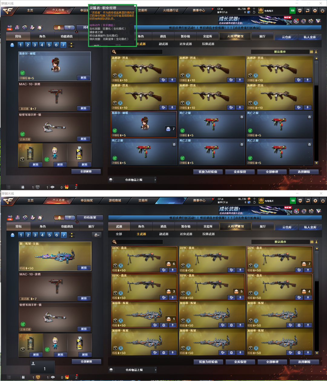 装备描述:排位:可以、、、、、生化四防(生化变更背包、可以看生化僵尸血量):无需换弹、6烈、6盘龙、斯泰尔-蝴蝶、KAC-涂鸦、死亡之眼、手斧镜、2生化减速雷、超级对讲机、全部弹匣、、、、、、、爆破四防:幻神、USP雷暴、USP神工天巧、2个COP雷霆、QBZ金色蔷薇、、、毁灭音效、火麒麟音效、黑骑士音效、、、7套雷霆、4套雷暴、3套神工天巧、、、生化四防(职业经理)爆破四防(晴雅)