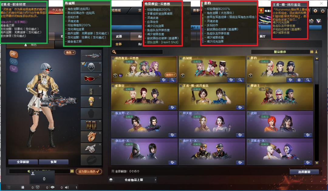 装备描述:排位:可以------------------生化全装(变更背包、查看僵尸血量):无需换弹、6烈、6炼狱、斯太尔蝴蝶、死亡之眼、MAC涂鸦、生化雷、超级对讲机、全部弹匣、、、、、、爆破四防:幻神音效(冠军之幻皮肤)、COP幻灵、2个柯尔特竞技荣光、、、、、FAMAS G2-天戎、G36幻影、白虎、QBZ天罚、、、幻神音效、裁决音效、雷神音效、黑骑士音效、、、6套幻灵、2套竞技荣光、、、生化四防(机械姬、职业经理)、爆破四防(云悠悠、影豹、王者闭月羞花)