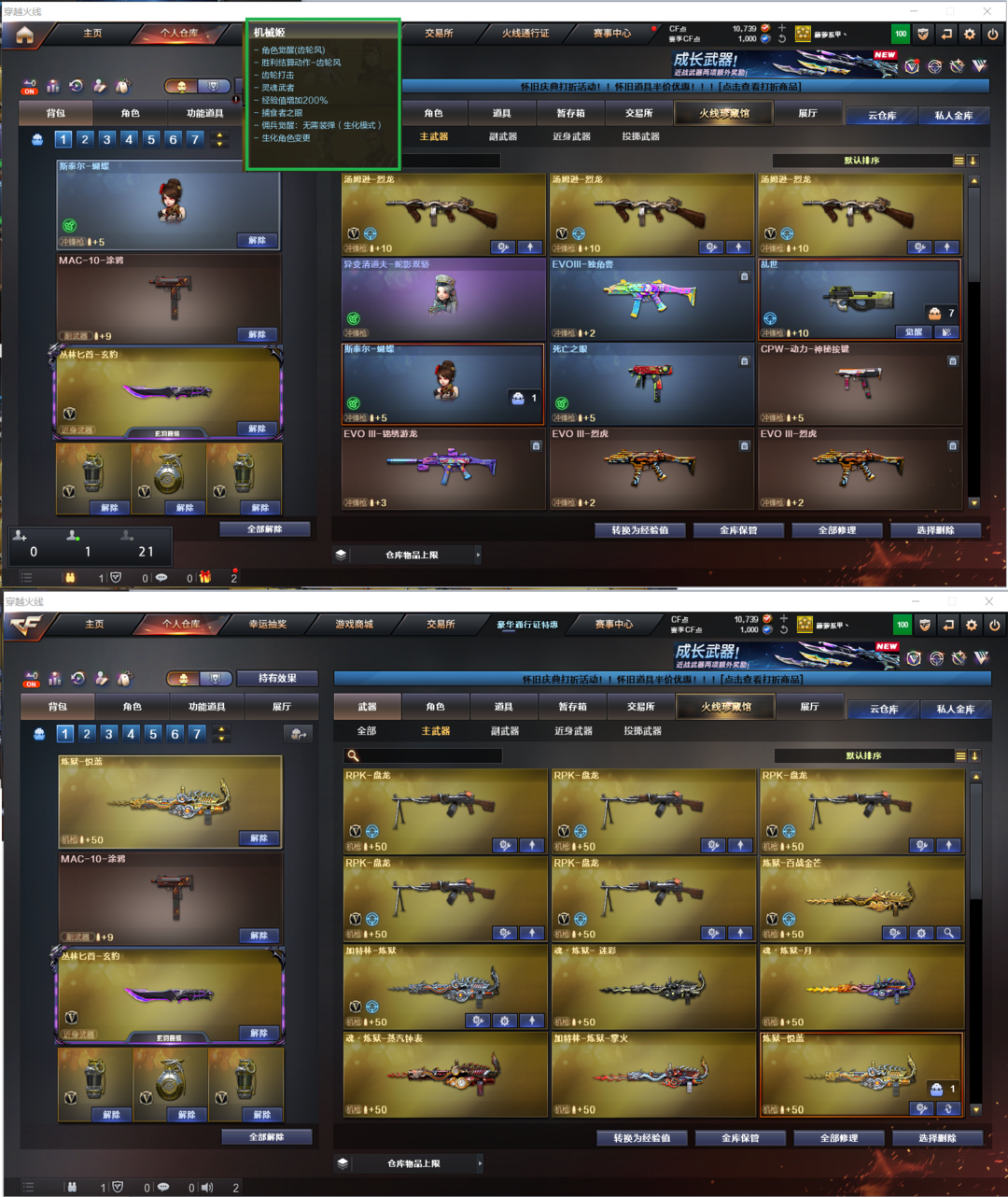 装备描述:排位:可以、、、、、、、生化(可以变更 背包、查看血量):无需换弹、3烈龙、5盘龙、2炼狱+音效、斯太尔蝴蝶、死亡之眼、异变清道夫-小人枪、MAC涂鸦、生化减速雷、超级对讲机、全部弹匣、、、、、、爆破四防:裁决音效卡、加利尔ACE-天袭、USP冥王、玄豹左轮、FAMAS G2-天戎、玄豹白虎、白虎、QBZ天罚、、、裁决音效、天罚音效、炼狱音效、、、10套玄豹雷、、、生化人物(机械姬)、爆破四防(传说星骇、玄豹)