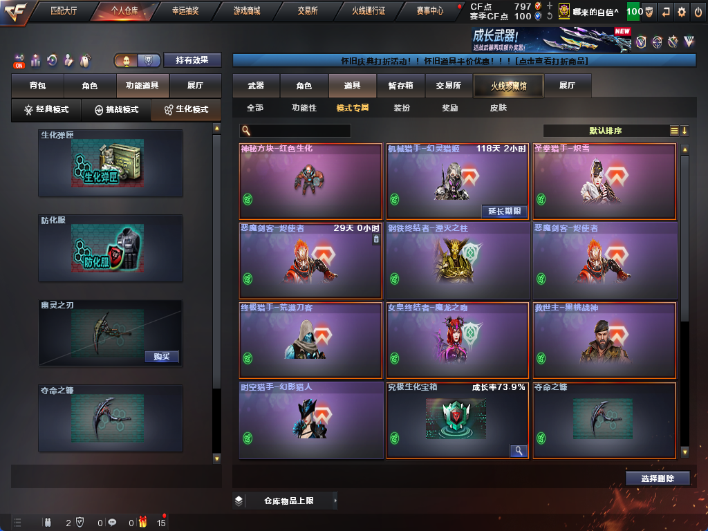生化炽芒蝶刃♉时空猎手♉13个生化皮肤♉斯泰尔蝴蝶小毒蜂♉满榴弹不退包全鬼可排位幻兽套♉无6盘6烈