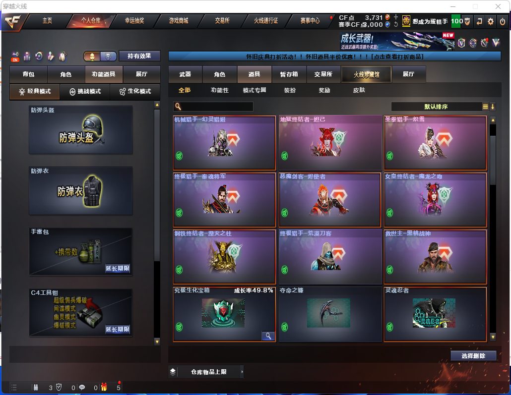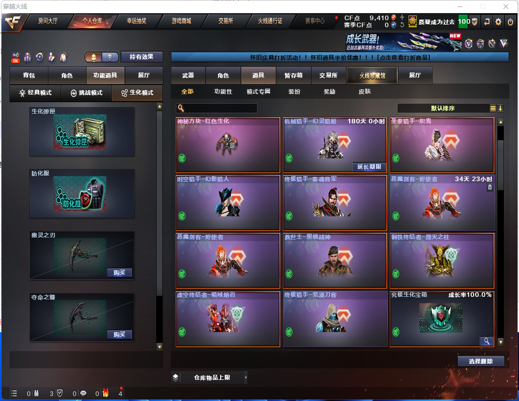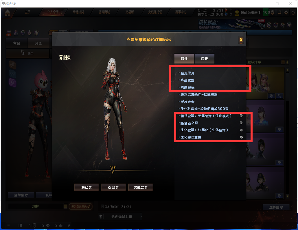 生化炽芒蝶刃♉荆棘♉四防生化背包♉斯泰尔蝴蝶枪娘♉幻神可排位♉6烈龙♉11个生化皮♉满榴弹全鬼不退包