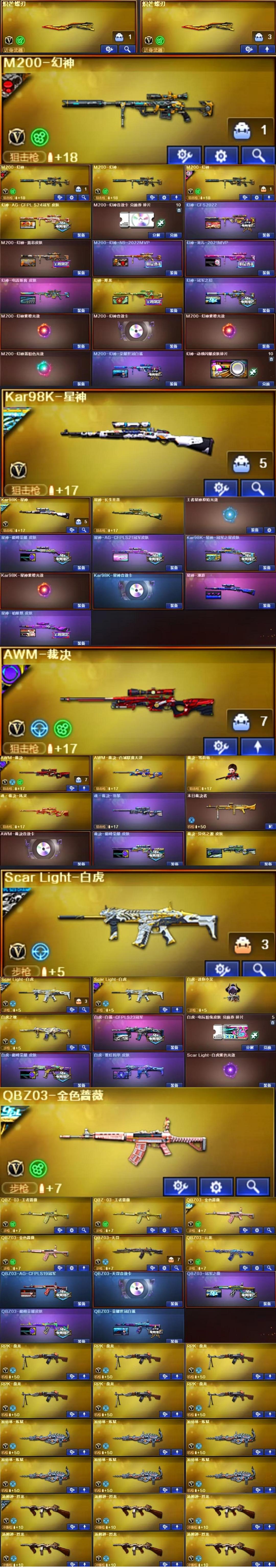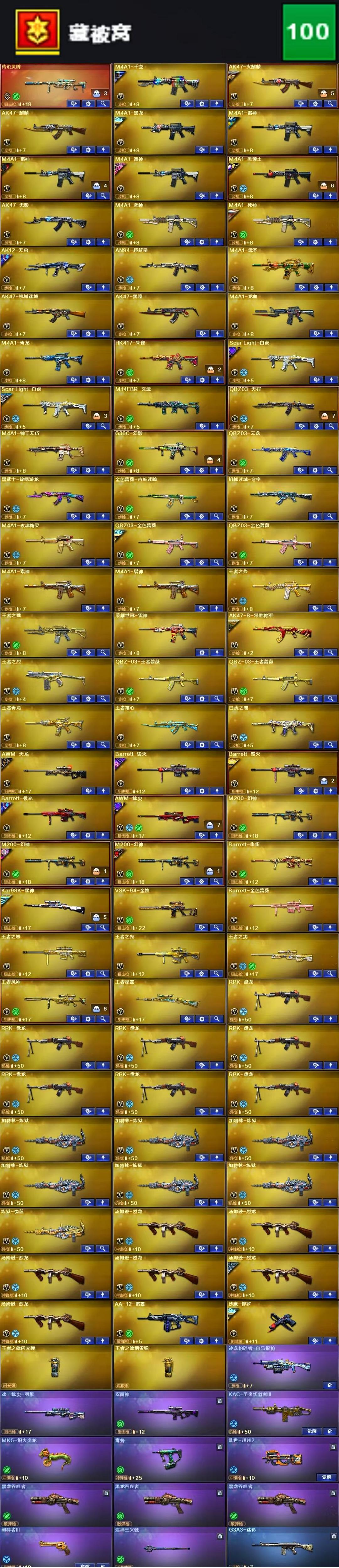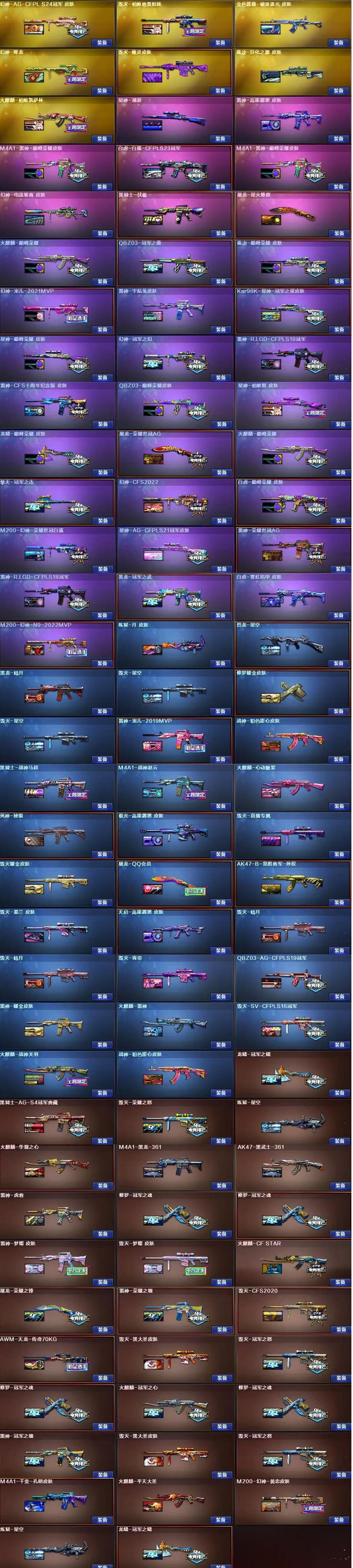 装备描述:王者武器:王者星霆;闪光弹-雷霆王者-觉醒版;高爆手雷-雷霆王者;雷霆王者之锋-觉醒版;烟雾弹-雷霆王者-觉醒版;炫金骑士;QBZ-03-王者蔷薇-觉醒版;炫金毁灭;王者之锋-觉醒版;炫金天龙;王者之势-觉醒版;王者青龙;王者之决-觉醒版;王者之怒-觉醒版;王者之光-觉醒版;王者之魄闪光弹;王者之魄高爆手雷;王者玉锋;王者之魄烟雾弹;炫金无影;炼狱-悦蓝-觉醒版;王者云击;炫金千变;王者之戮-觉醒版;王者霜心;王者之烈-觉醒版 英雄武器:迷你泡泡象;屠龙;柯尔特-荣耀世冠白鲨2023;烟雾弹-竞技荣光;高爆手雷-竞技荣光;闪光弹-竞技荣光;Barrett-毁灭;M4A1-雷神;RPK-盘龙;柯尔特-无冕之王;荣耀世冠-龙啸;荣耀世冠-雷神;荣耀世冠-柯尔特;擎天;M4A1-死神;M4A1-猎神;烟雾弹-云龙;QBZ03-云龙;沙鹰-天神;AK12-天启;AK47-无影;AK47-麒麟;QBZ03-金色蔷薇;汤姆逊-烈龙;COP 357-云龙;闪光弹-云龙;高爆手雷-云龙;云龙扇;黑武士-锦绣游龙;Scar Light-白虎;炽芒蝶刃;斩神刀-雷暴;雷霆之锋;高爆手雷-雷暴;闪光弹-雷暴