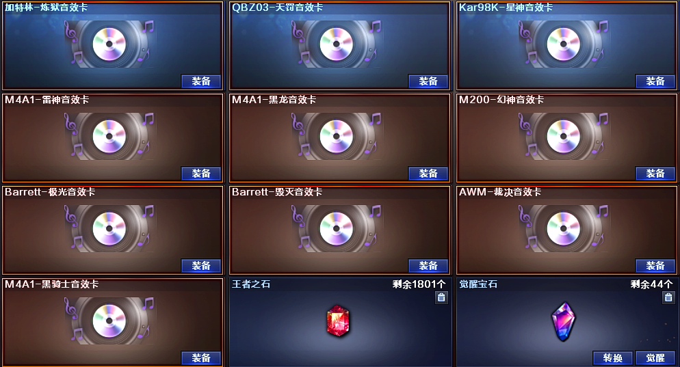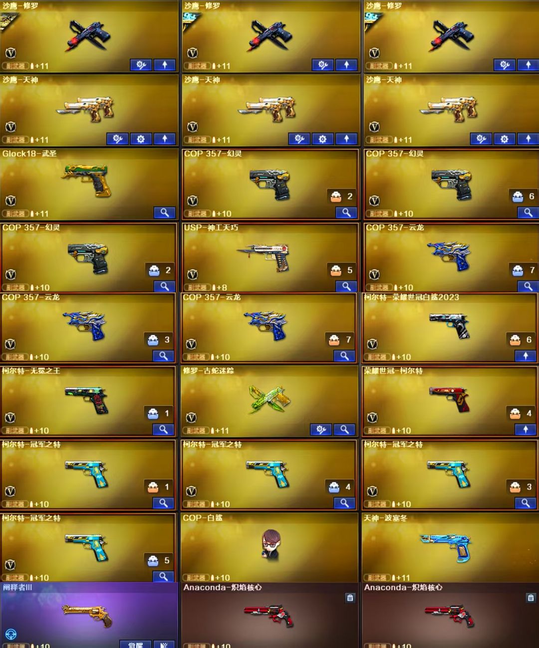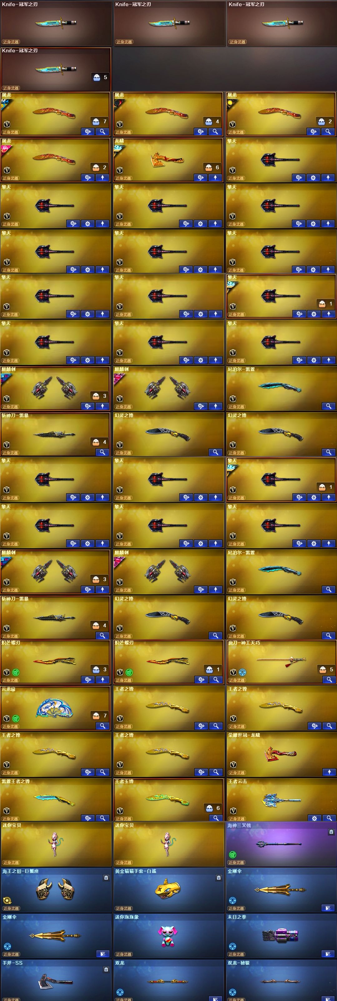 装备描述:王者武器:王者星霆;闪光弹-雷霆王者-觉醒版;高爆手雷-雷霆王者;雷霆王者之锋-觉醒版;烟雾弹-雷霆王者-觉醒版;炫金骑士;QBZ-03-王者蔷薇-觉醒版;炫金毁灭;王者之锋-觉醒版;炫金天龙;王者之势-觉醒版;王者青龙;王者之决-觉醒版;王者之怒-觉醒版;王者之光-觉醒版;王者之魄闪光弹;王者之魄高爆手雷;王者玉锋;王者之魄烟雾弹;炫金无影;炼狱-悦蓝-觉醒版;王者云击;炫金千变;王者之戮-觉醒版;王者霜心;王者之烈-觉醒版 英雄武器:迷你泡泡象;屠龙;柯尔特-荣耀世冠白鲨2023;烟雾弹-竞技荣光;高爆手雷-竞技荣光;闪光弹-竞技荣光;Barrett-毁灭;M4A1-雷神;RPK-盘龙;柯尔特-无冕之王;荣耀世冠-龙啸;荣耀世冠-雷神;荣耀世冠-柯尔特;擎天;M4A1-死神;M4A1-猎神;烟雾弹-云龙;QBZ03-云龙;沙鹰-天神;AK12-天启;AK47-无影;AK47-麒麟;QBZ03-金色蔷薇;汤姆逊-烈龙;COP 357-云龙;闪光弹-云龙;高爆手雷-云龙;云龙扇;黑武士-锦绣游龙;Scar Light-白虎;炽芒蝶刃;斩神刀-雷暴;雷霆之锋;高爆手雷-雷暴;闪光弹-雷暴