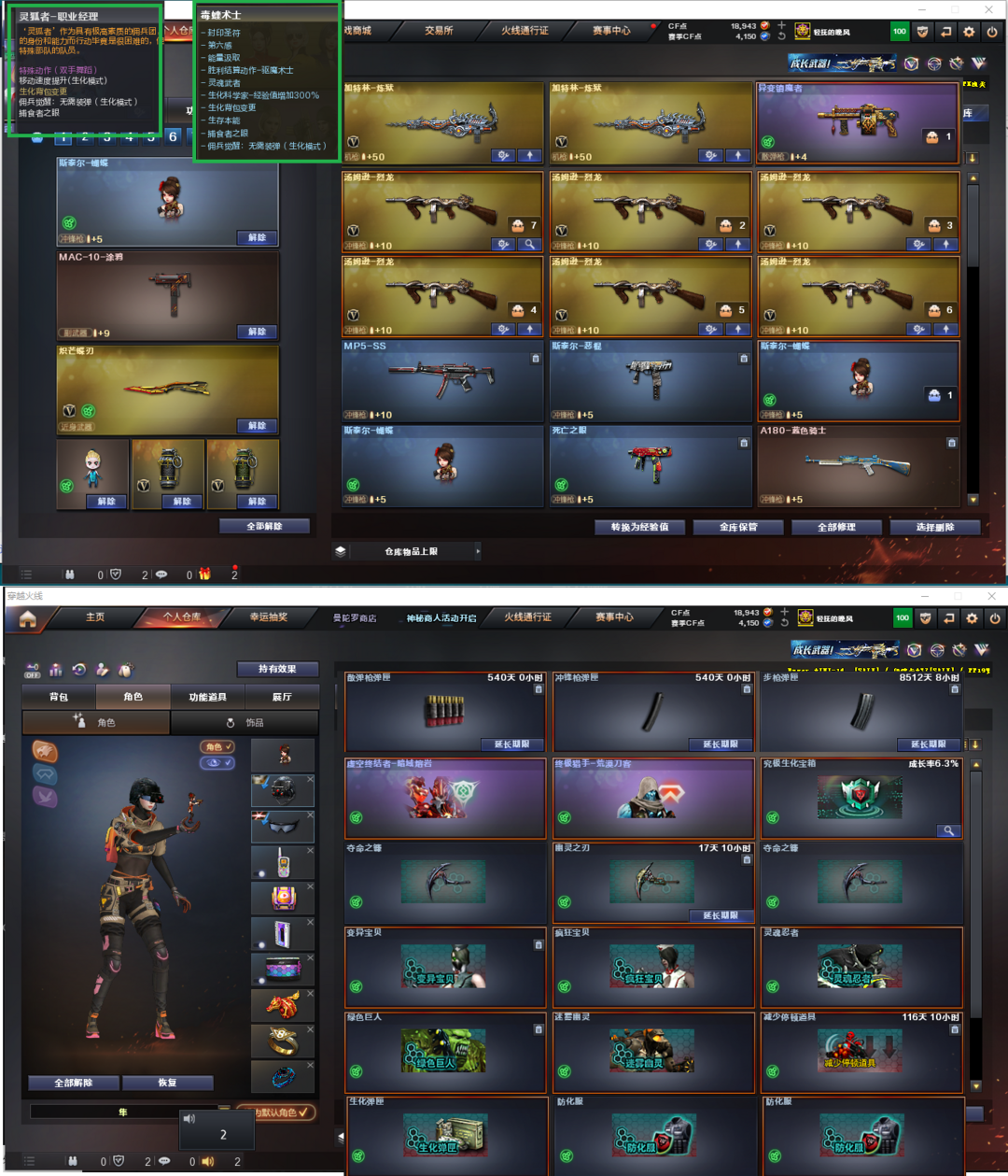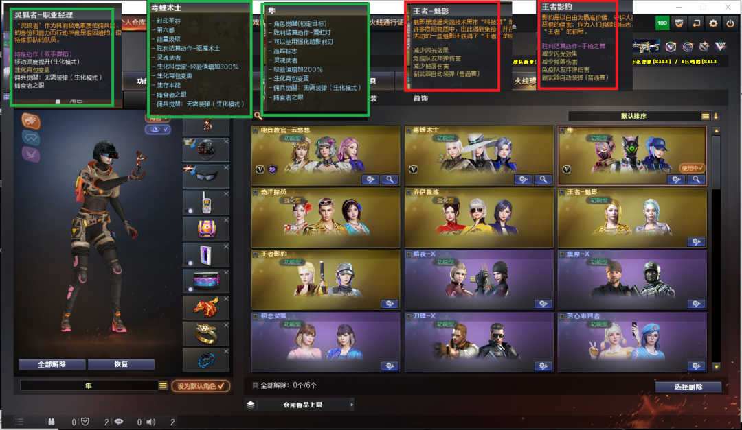 装备描述:排位:可以、、、、、、生化四防全装(可以变更背包、查看生化僵尸血量):无需换弹、6烈、盘龙、炼狱、斯太尔蝴蝶、异变镇魔者、死亡之眼、MAC涂鸦、炽芒蝶刃、生化减速雷、超级对讲机、全部弹匣、、、、、爆破四防:幻神3皮+音效(23白鲨、冠军之幻、电流骇客皮肤)、98K星神、王者风神、USP雷暴、USP神工天巧、柯尔特竞技荣光、COP云龙、冠军之特、G36幻影、白虎、QBZ金色蔷薇、、、幻神音效、蔷薇音效、、、3套雷暴、2套云龙、1套雷霆王者、、、生化四防(毒蝰术士、隼、嘉年华灵狐、职业经理)、爆破四防(王者魅影、王者影豹)
