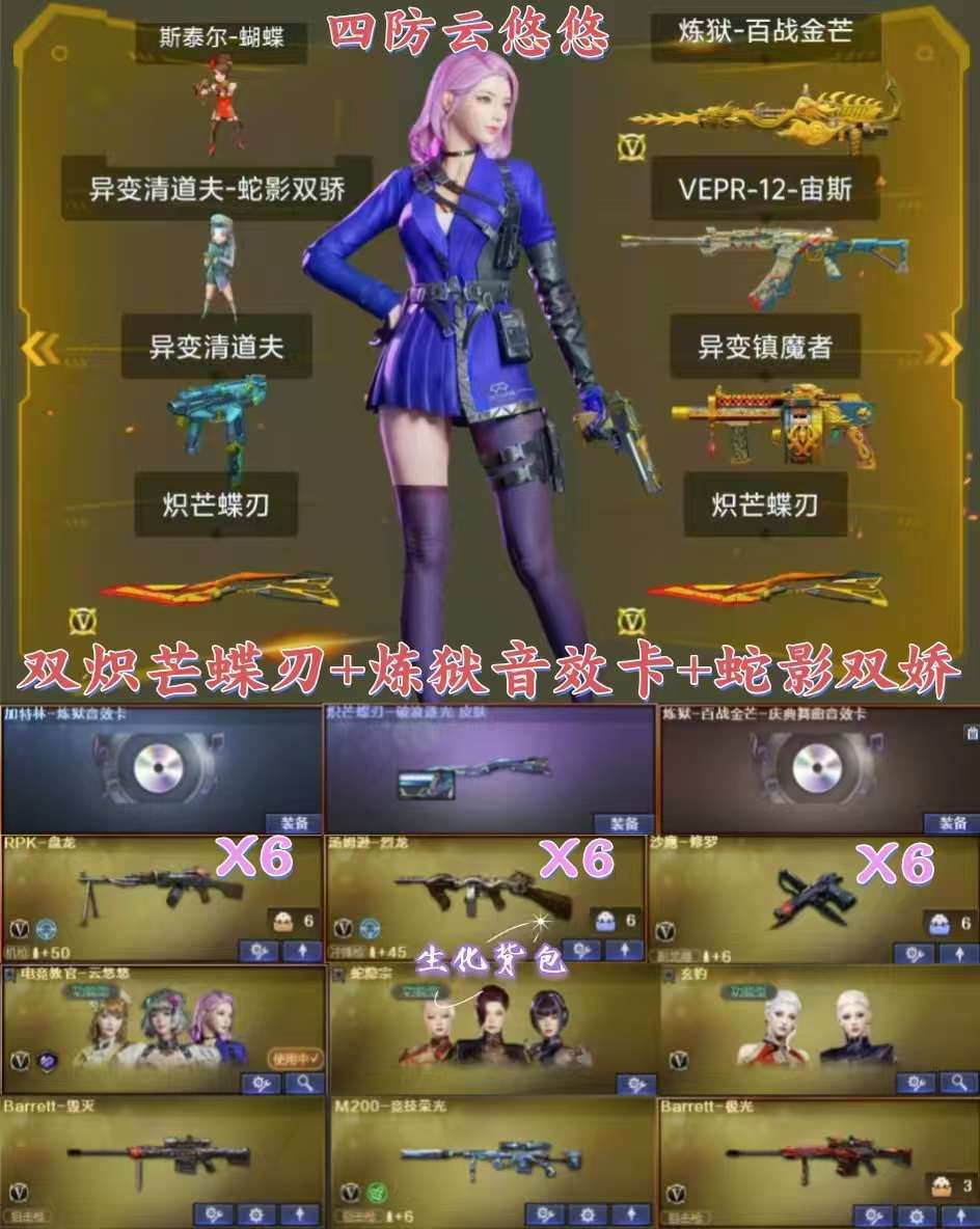 双炽芒蝶刃+蝴蝶清道夫蛇影双娇6盘6烈+炼狱音效卡宙斯套镇魔者+M200竞技荣光裁决极光+生化全弹夹