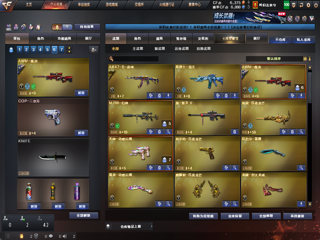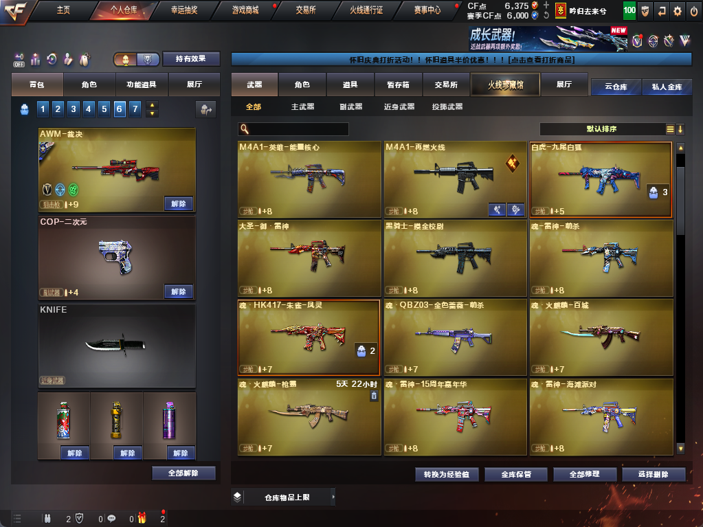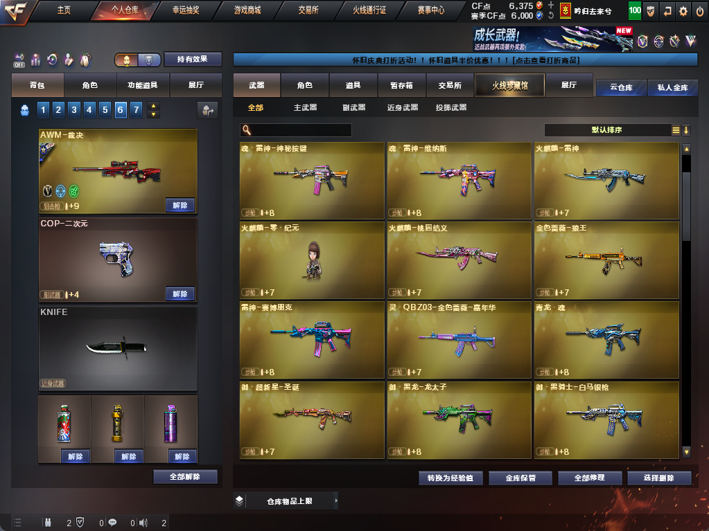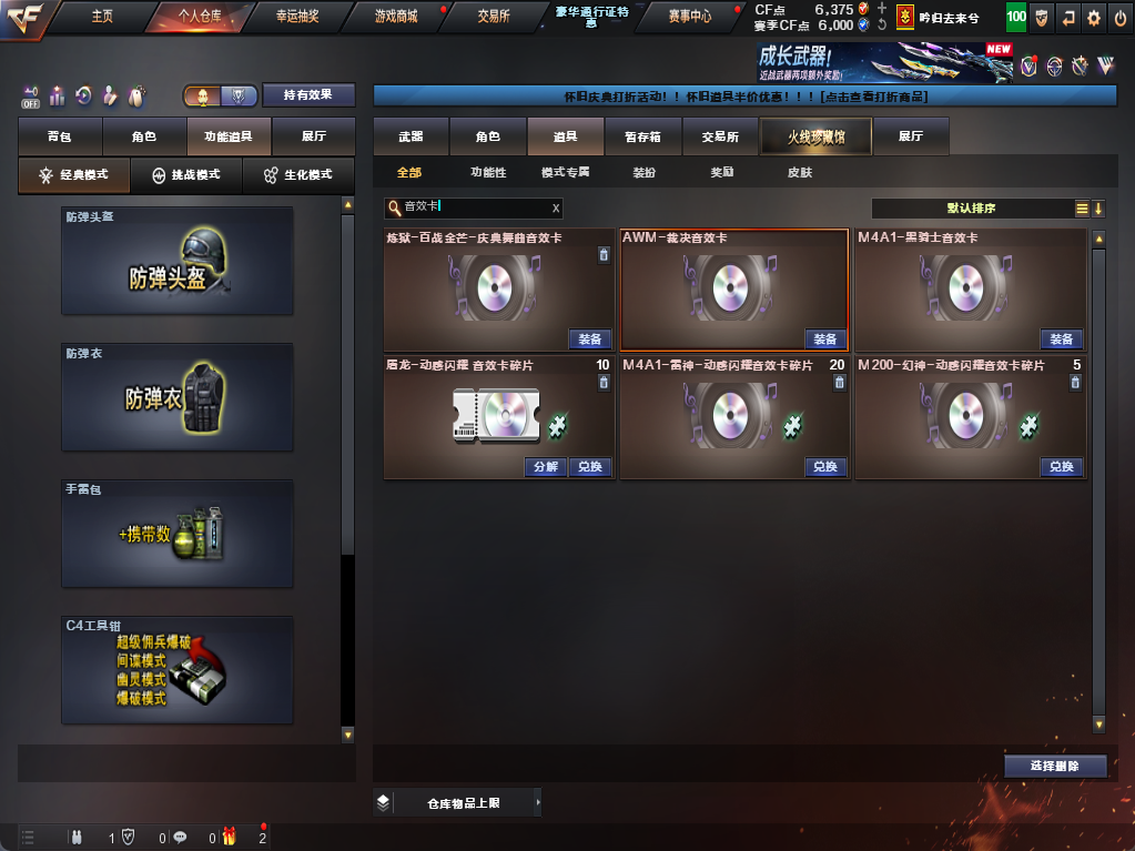 装备描述:爆破全装*主流爆破武器基本都有*裁决音效卡*幻神*雷神*白虎*QBZ金色蔷薇*加利尔ACE等