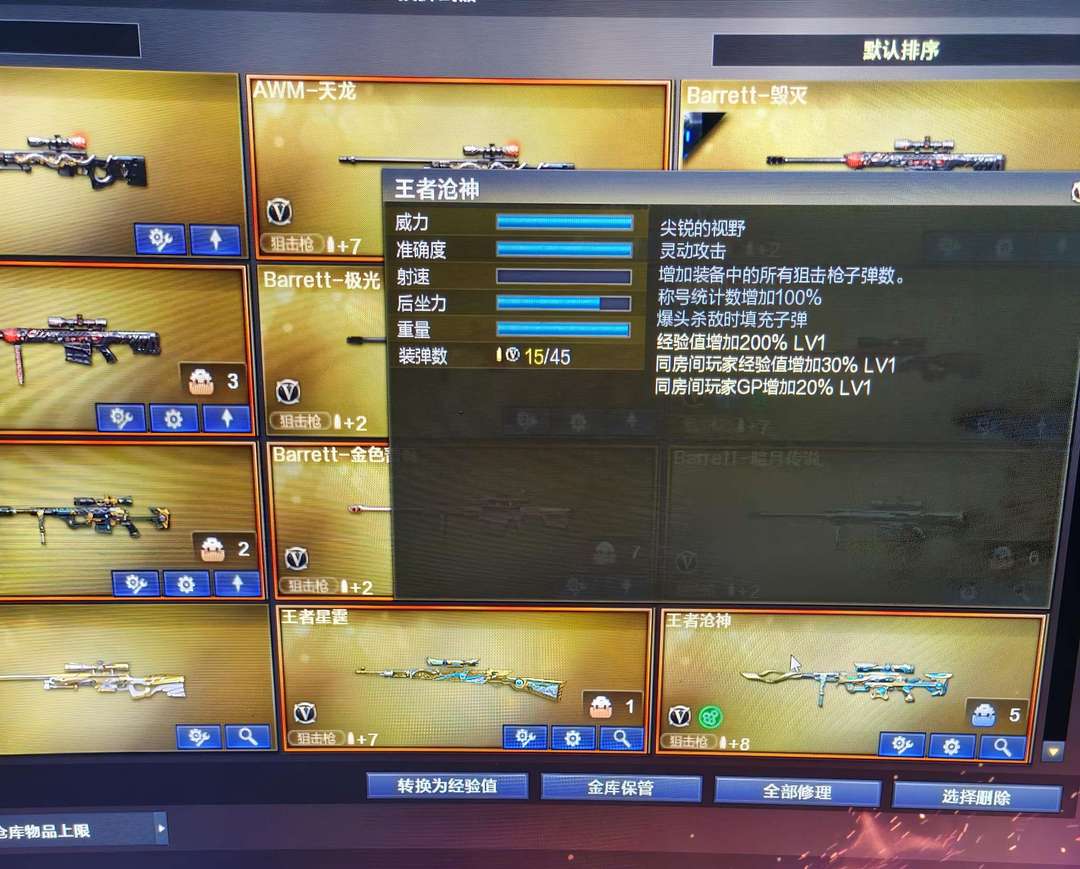 装备描述:八面玲珑+3把蝴蝶刀+斯太尔蝴蝶+6烈龙+3炼狱+5盘龙+王者星神+王者裁决+G36+玄武+传说夜影+生化迷你手雷7个+角色:神威莲华+隼+晴雅:都是4防