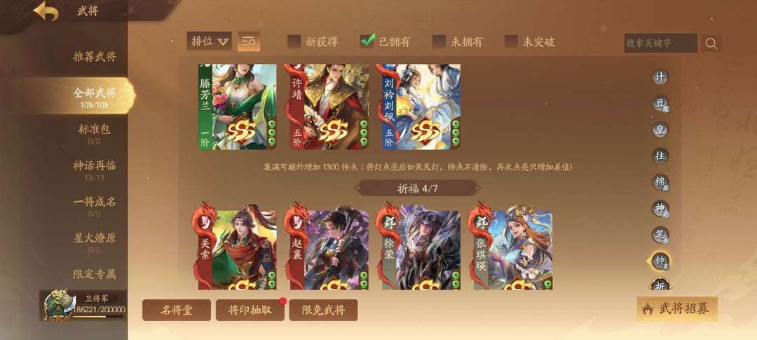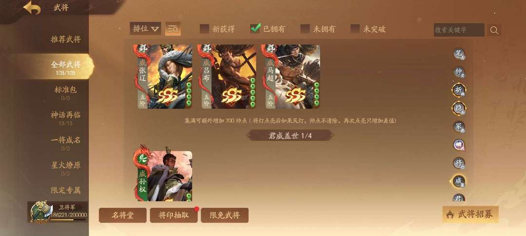 装备描述:官阶卫将军, 神-张飞,黄忠,庞统, 威-张辽,吕布,马超 乐系列封多武将。 请游戏局内保持文明,防止禁言影响他人游戏,祝您玩得愉快!