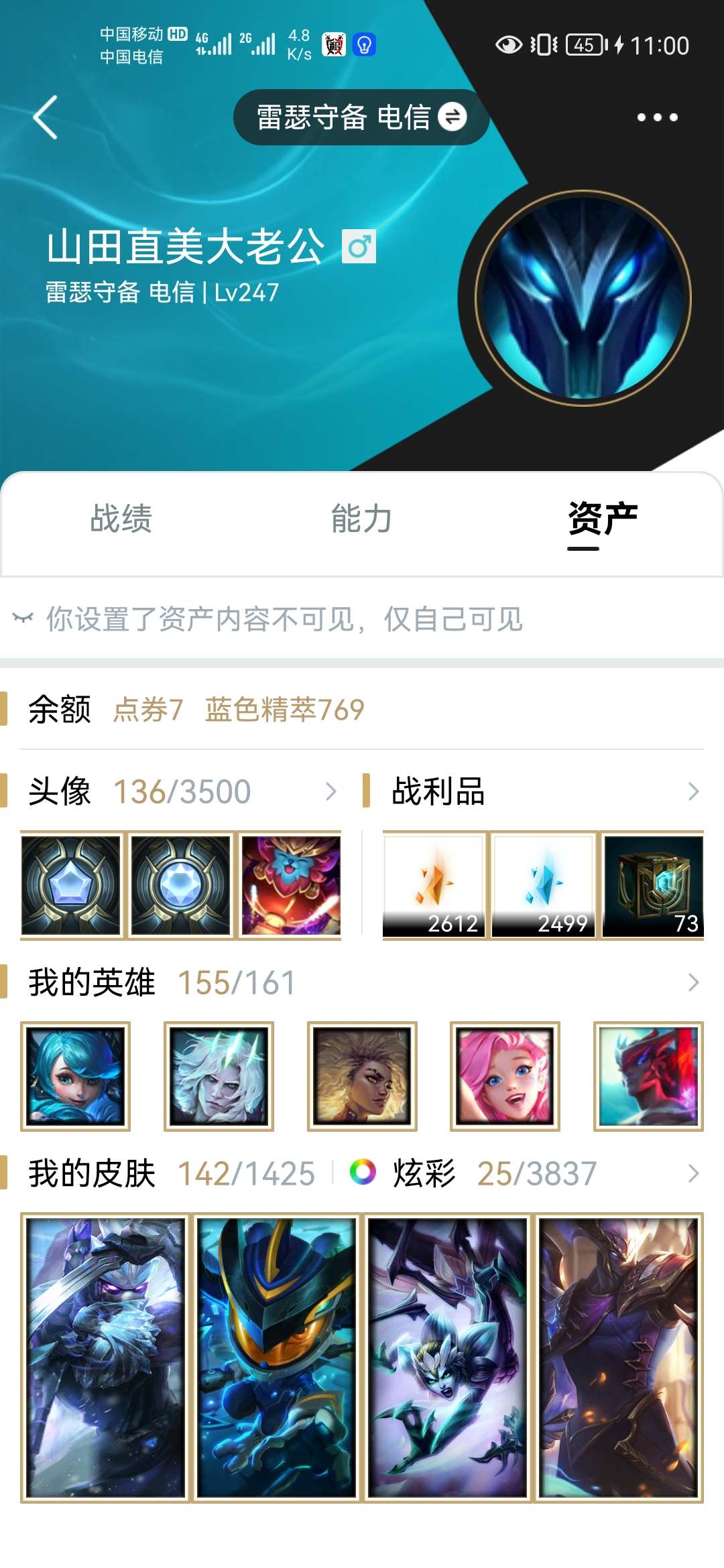 雷瑟守备,电信区,155英雄142皮肤,可排位