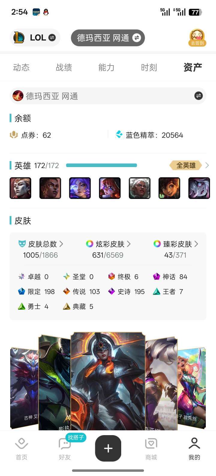 .全英雄,千款皮肤,可排位,冰雪节年限神话至臻很多,高质量皮肤,全英雄,炫彩皮肤也有
