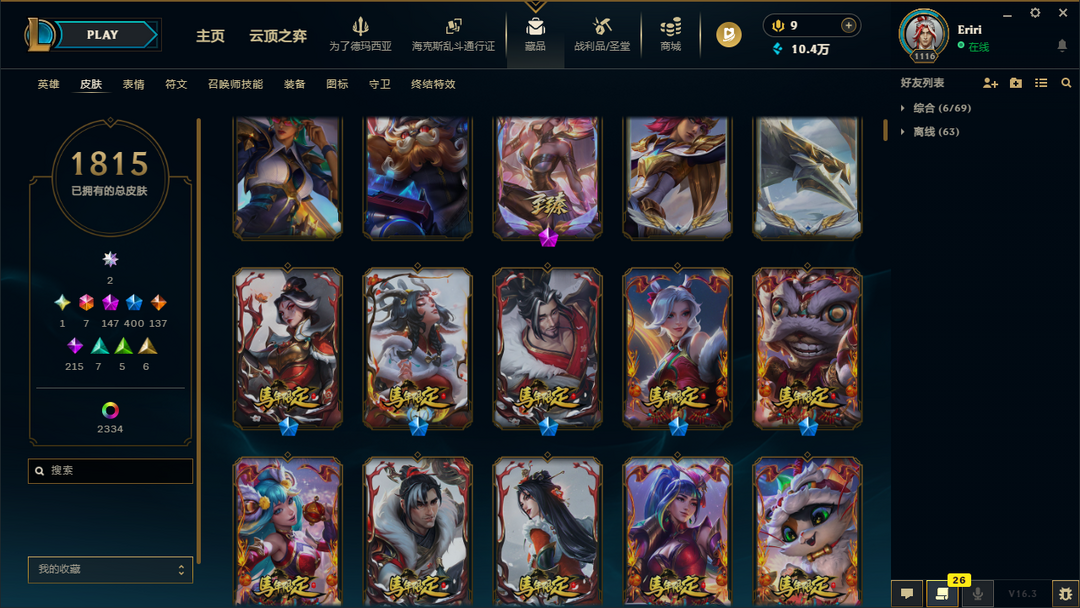 装备描述:1815原皮❤联盟不朽卡莎阿狸❤圣堂金克斯❤踏雪寻梅龙马烈焰全套❤神话娜美卢锡安❤冰原核弹