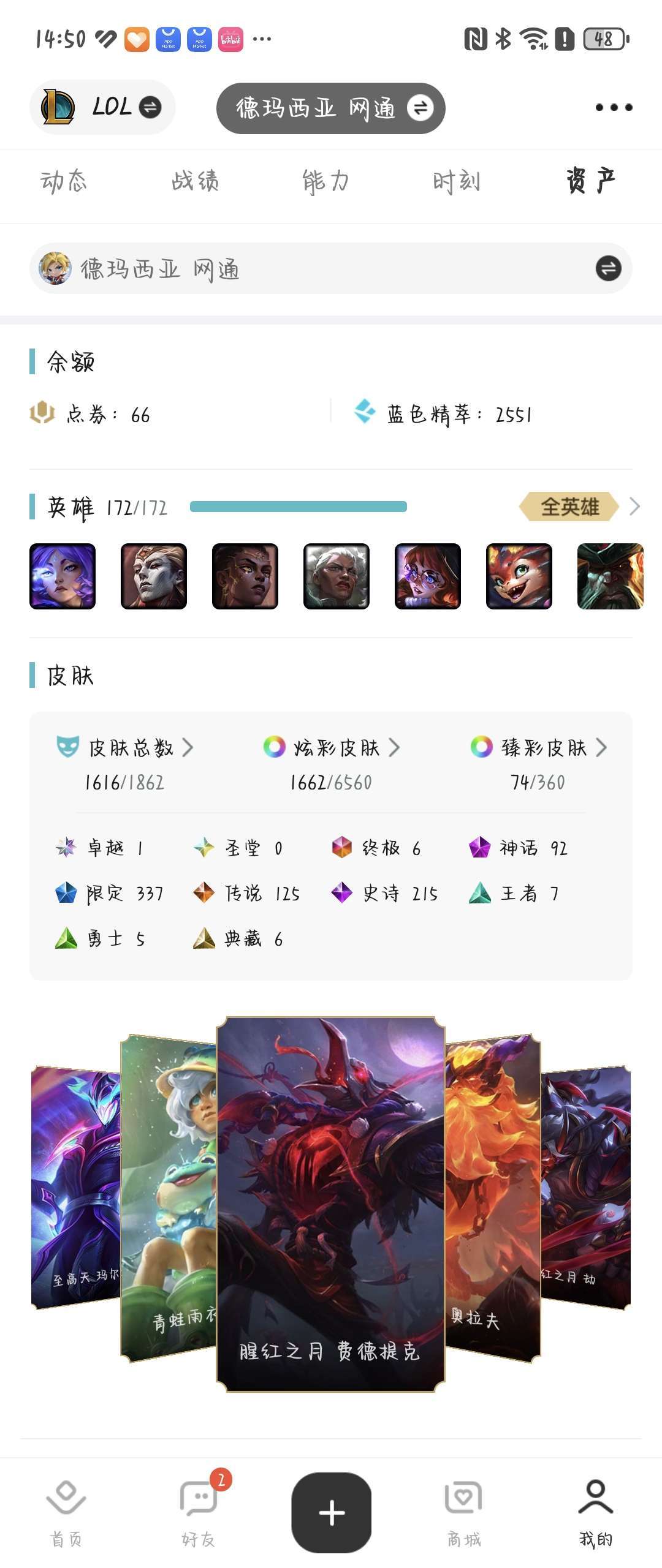 装备描述:不做标题党!英雄皮肤多,炫彩多,希望各位老板尽量不要恶意挂机!祝各位玩的愉快