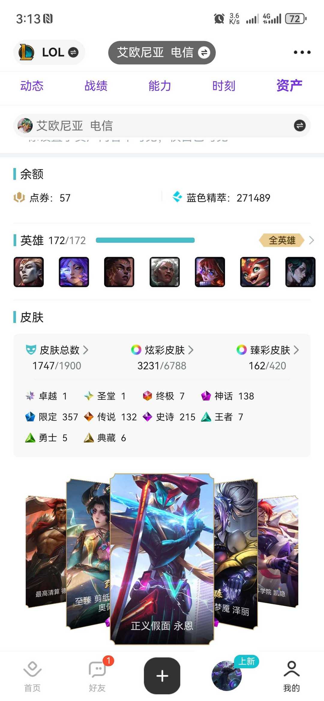 艾欧尼亚❤️妹子号❤️1747皮3231炫彩162臻彩❤️圣堂佛耶戈名人堂卡莎神话阿狸❤️云顶神话