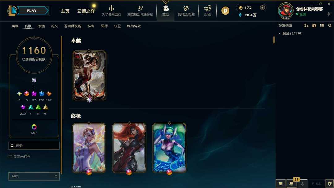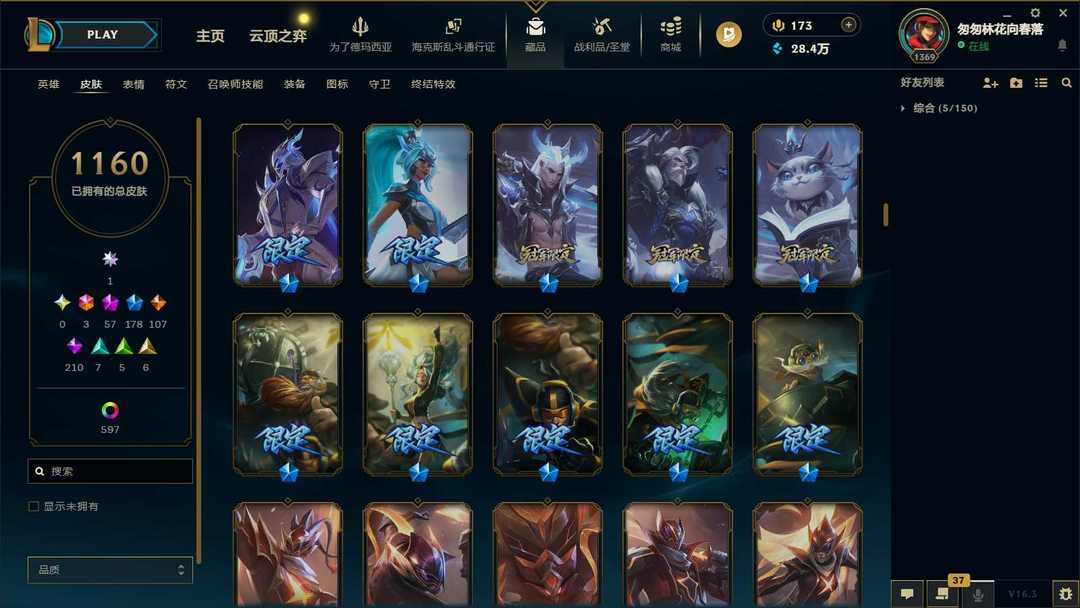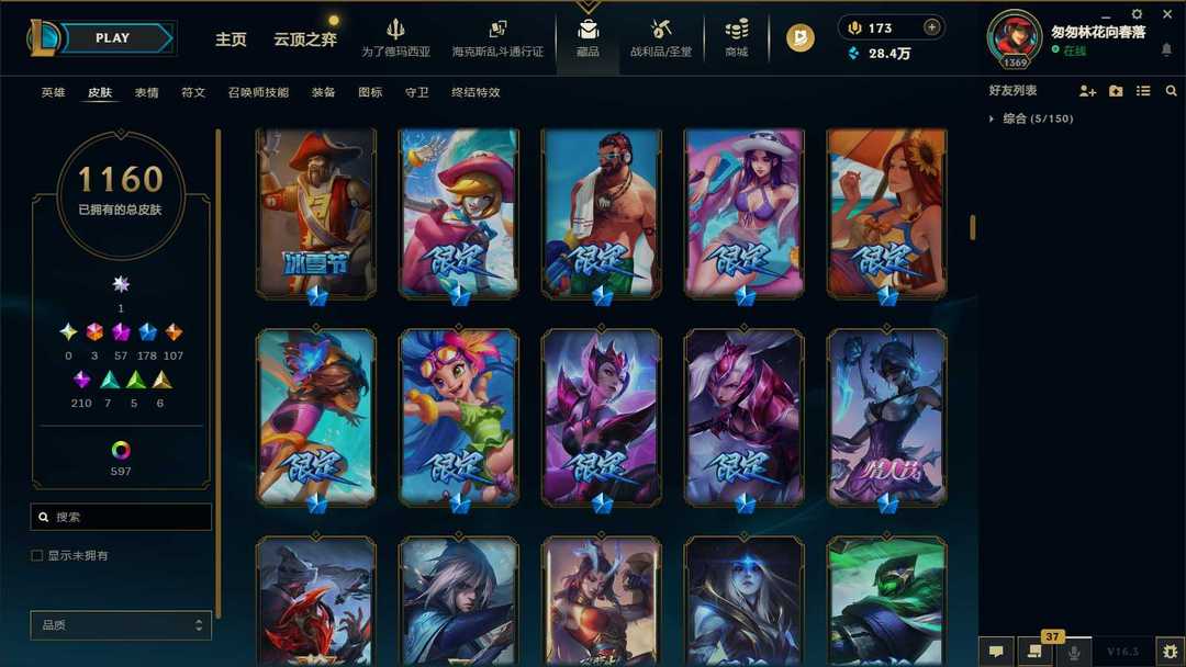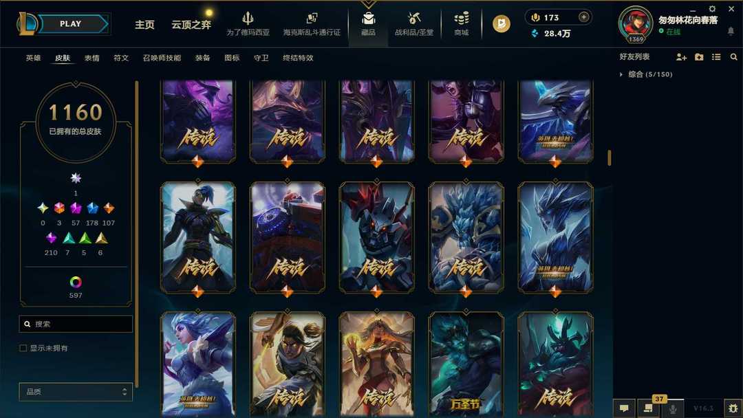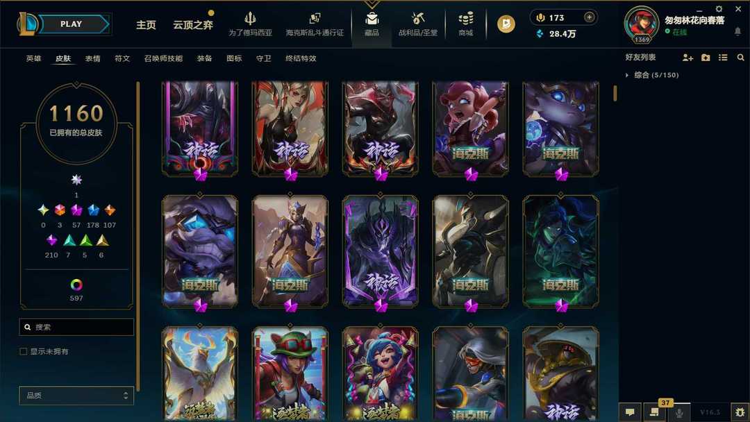 【泡泡】1760皮肤♥1160原皮♥597炫彩♥殿堂卡莎♥39臻彩♥57神话♥178限定♥210传说
