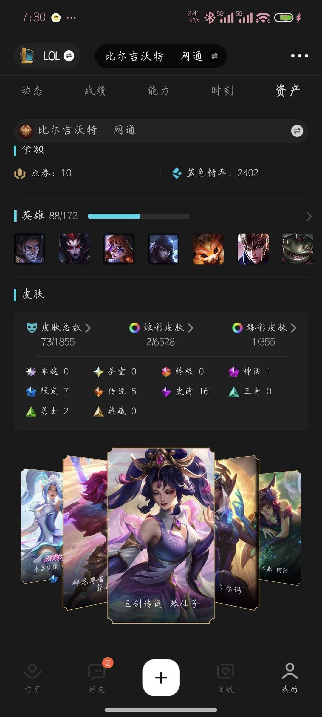 比较老的账号,很长时间没玩过段位,皮肤不多