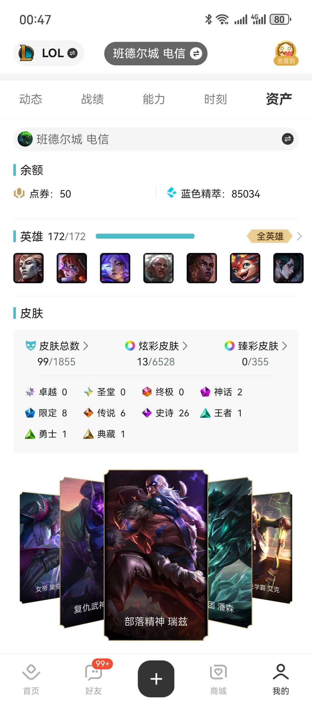 装备描述:LOL英雄联盟,翡翠4,全英雄,99个皮肤。好皮肤只有十几个,介意皮肤的慎拍,英雄已经满了。