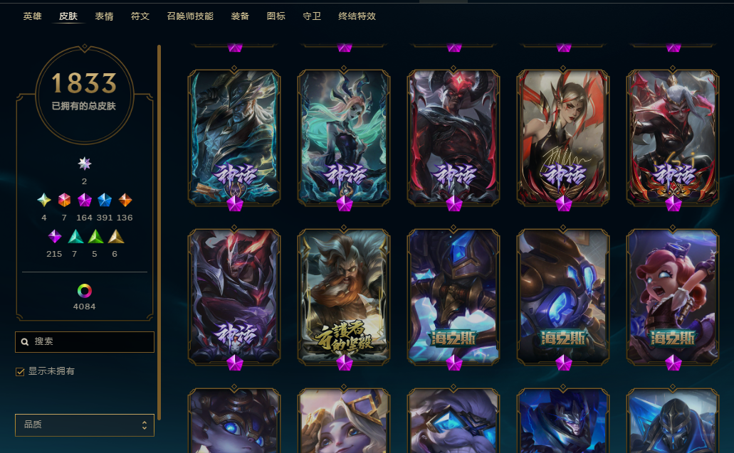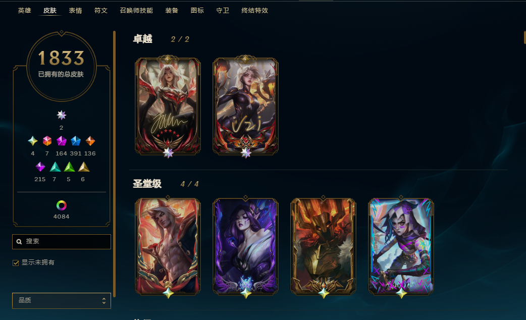 ⭐沉溺暗影⭐极品1833皮肤4084炫彩210臻彩⭐签名阿狸⭐全圣堂神话⭐宗师成就⭐小小格温巴黎棋盘
