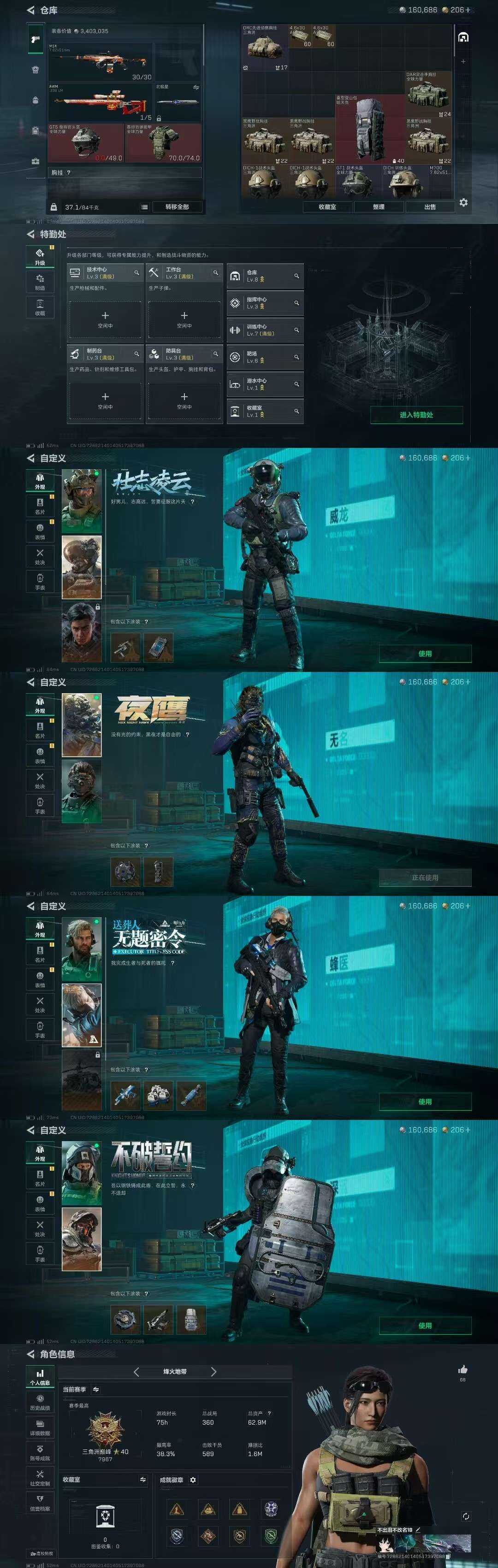 装备描述:威龙-壮志凌云 无名-夜鹰 蜂医-送葬人·无题密令 红狼-电锯惊魂 深蓝-不破誓约 北极星 处刑者 黑鹰