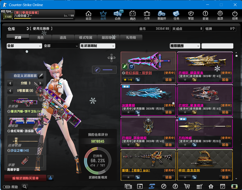 限制: 撤单率<70%才可租用此帐号装备描述:蛇神冰璃寒蟒,万钧神威,次元裁决,四件套,狼契,3-22赛季悬赏, 已经去黑雾,重铸怀旧邪皇圣帝,电锯,盘龙血煞。海皇之怒。黑龙炮、旋风、金红双蝎,赛季悬赏 6绿野7朋克8魔咒9巨龙10蒸汽11恐龙12奇幻13星战14遗迹15超械16奇境17沙漠18超能19冰海 如果登录后看到没武器,麻烦看看是不是登录错大区哈 怀旧黑龙炮、电锯、斧头、金红双蝎、死亡骑士、