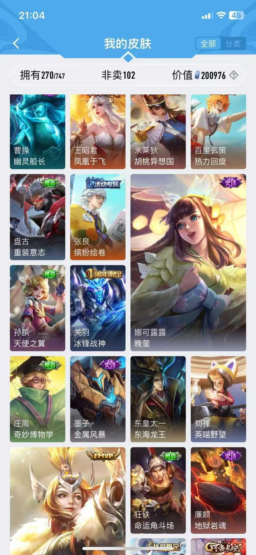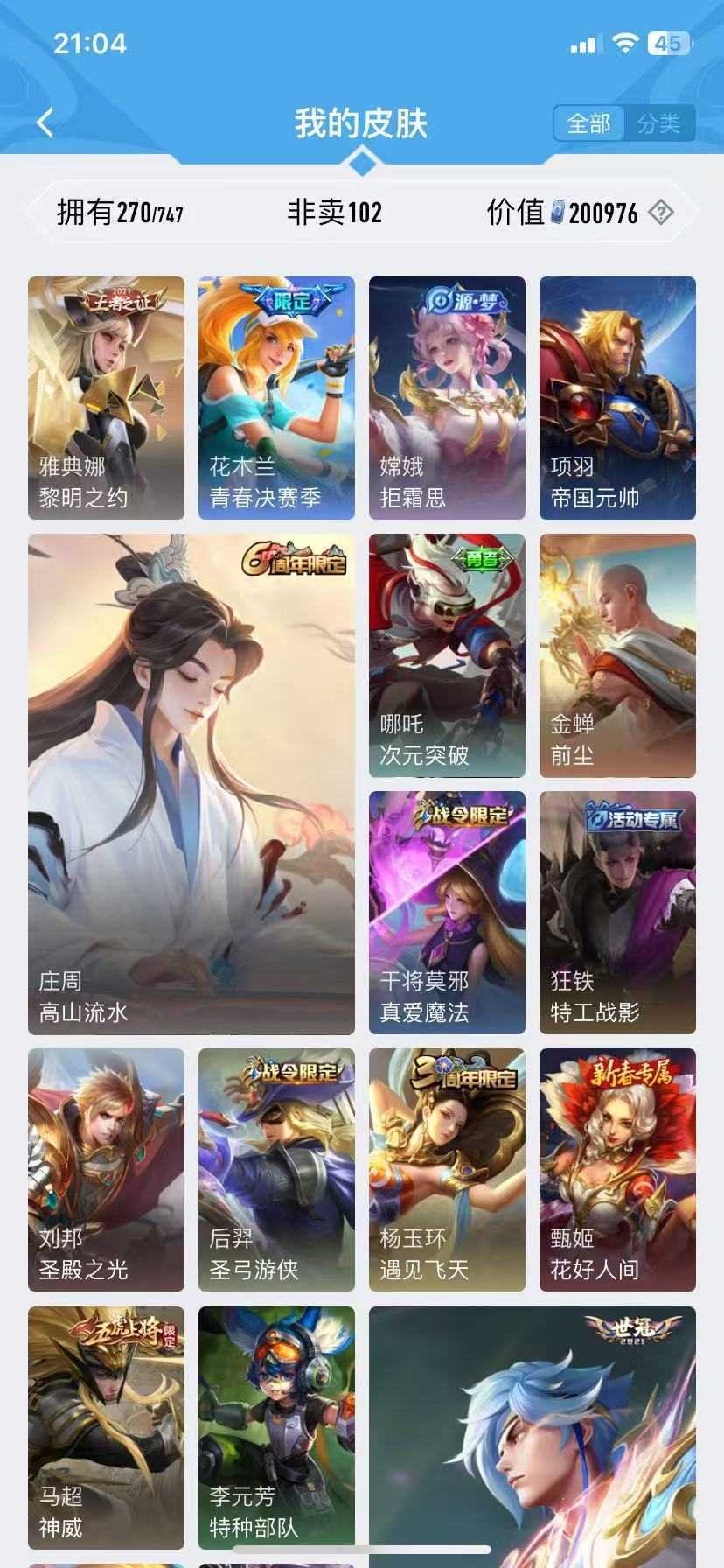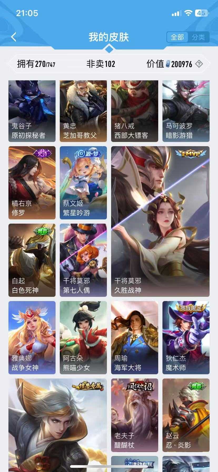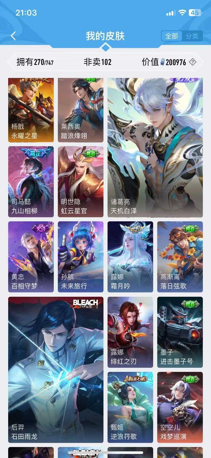 诸葛亮无双♥千山共赴♥九山相柳♥万灵启世♥霜月尽♥傲雪梅枪♥青春决赛季♥启示♥李逍遥神威