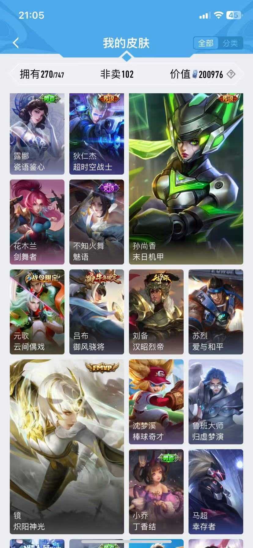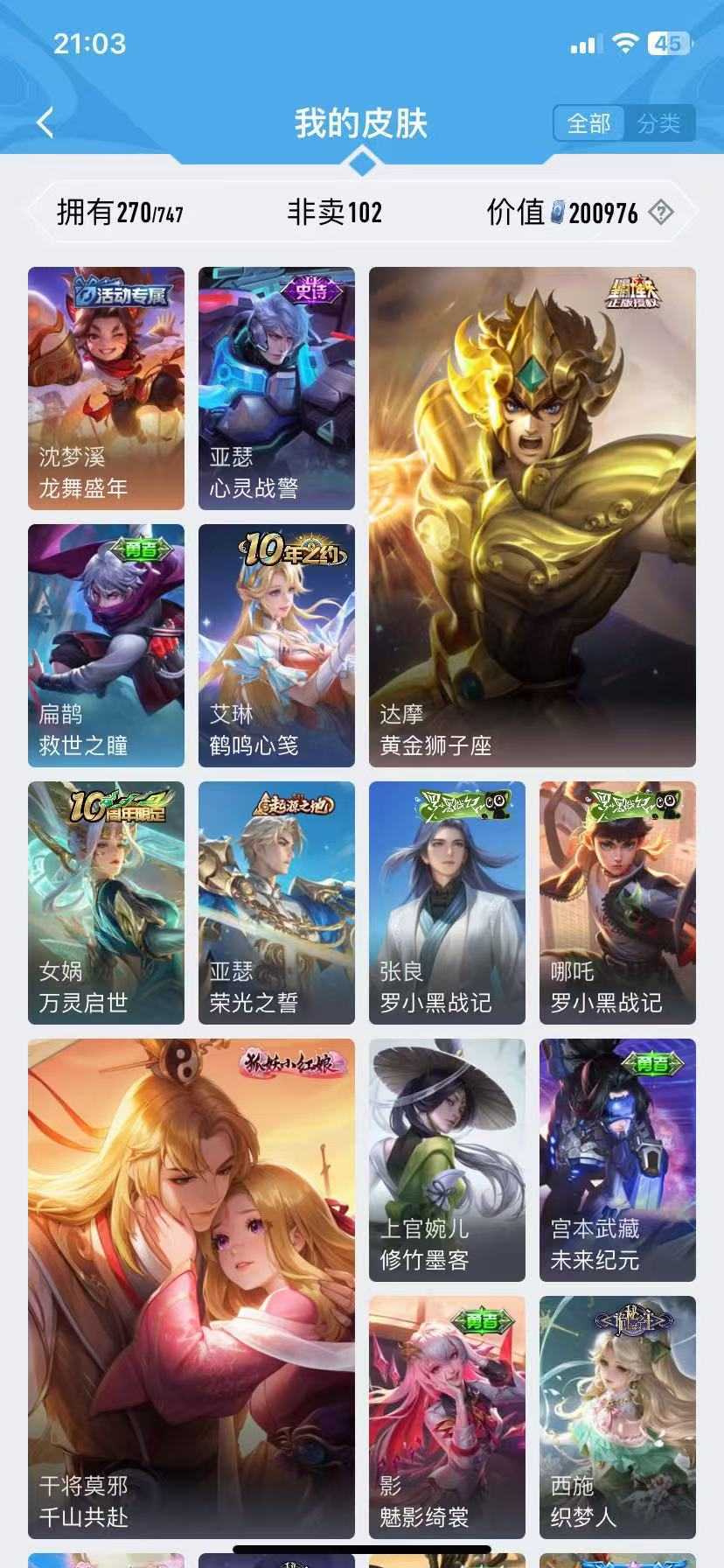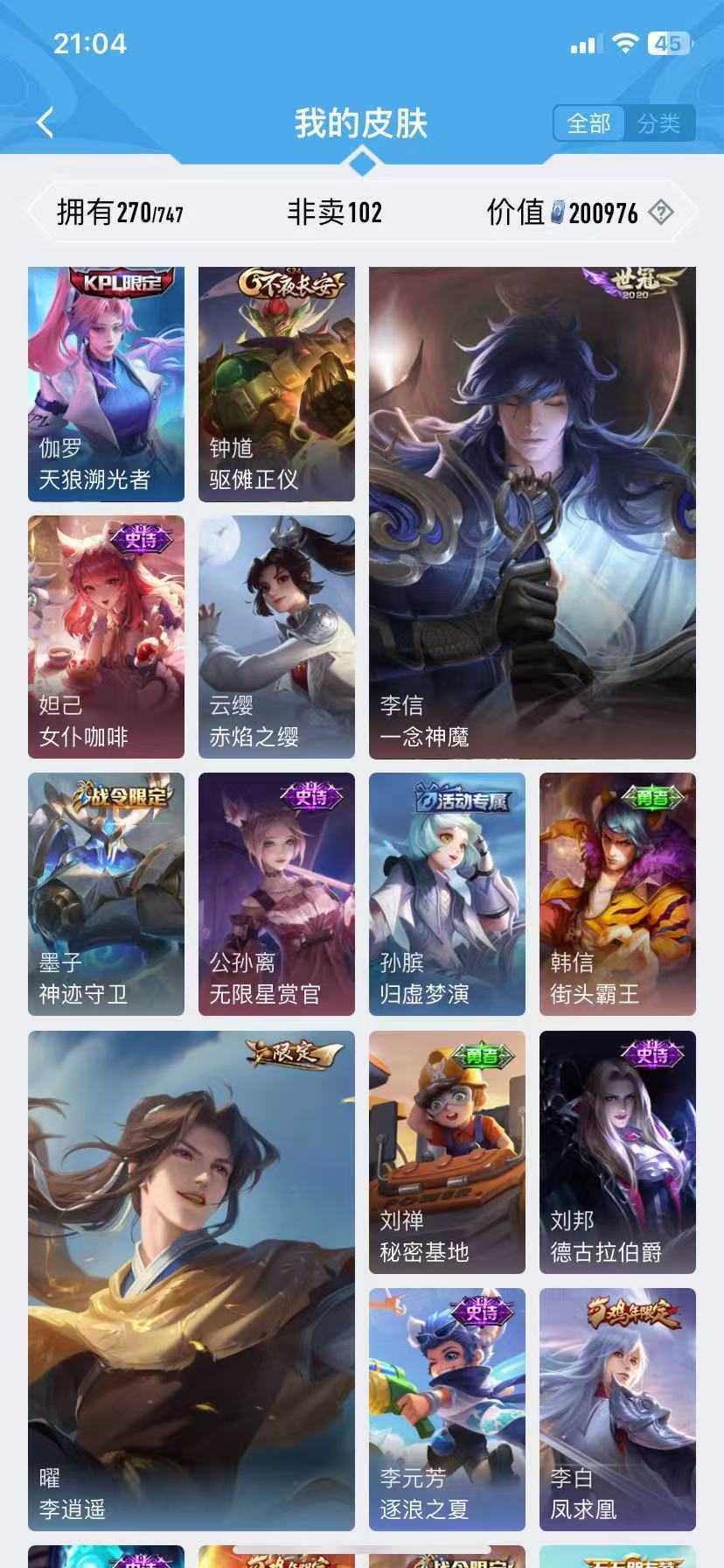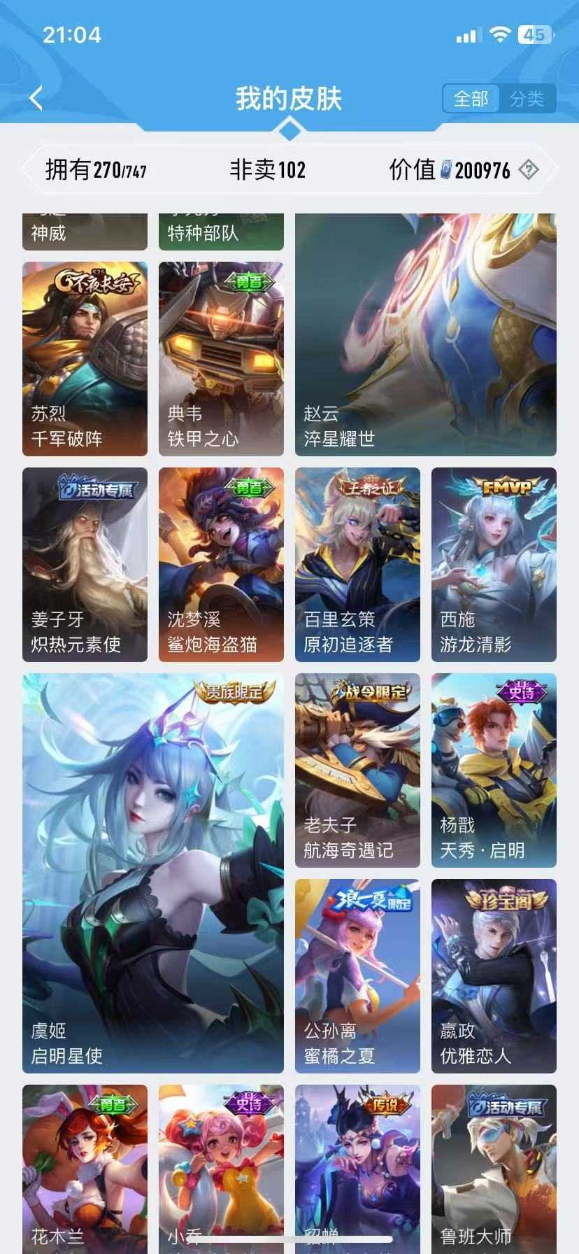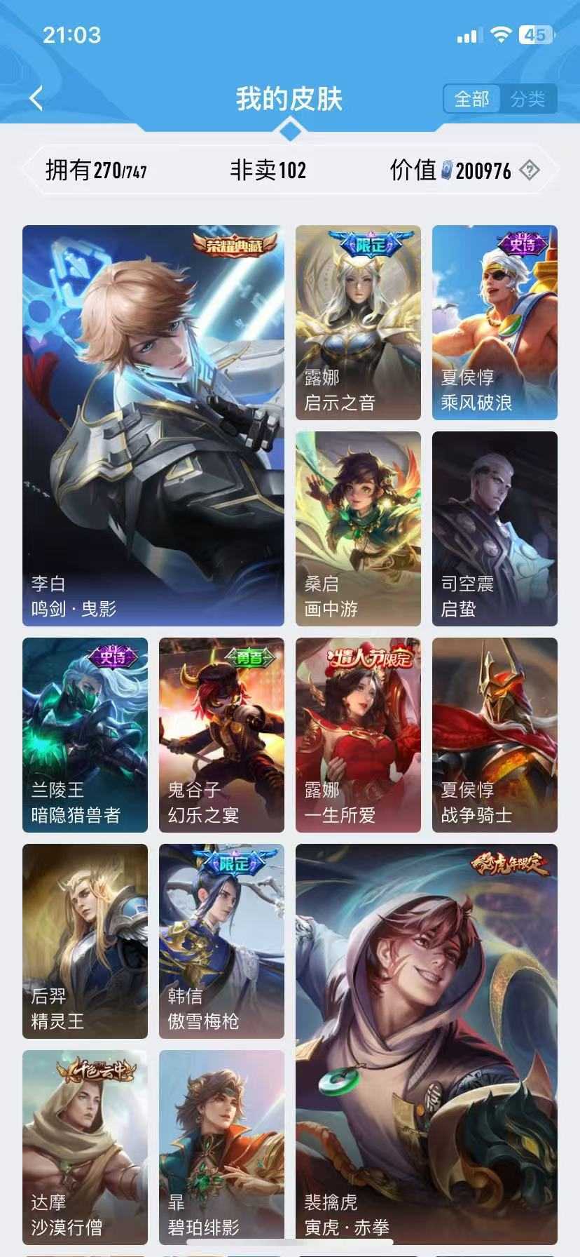 诸葛亮无双♥千山共赴♥九山相柳♥万灵启世♥霜月尽♥傲雪梅枪♥青春决赛季♥启示♥李逍遥神威