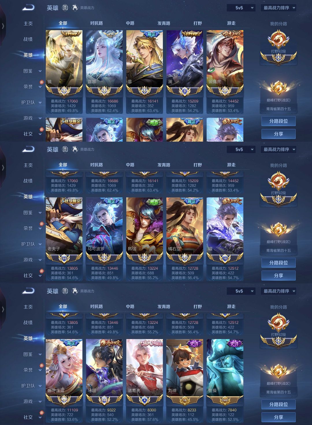 三月在榜小国标打野+9省标韩信澜孙悟空❤️历国服最强打野9个大国标1w7镜露娜老虎曜暃诸葛亮马超