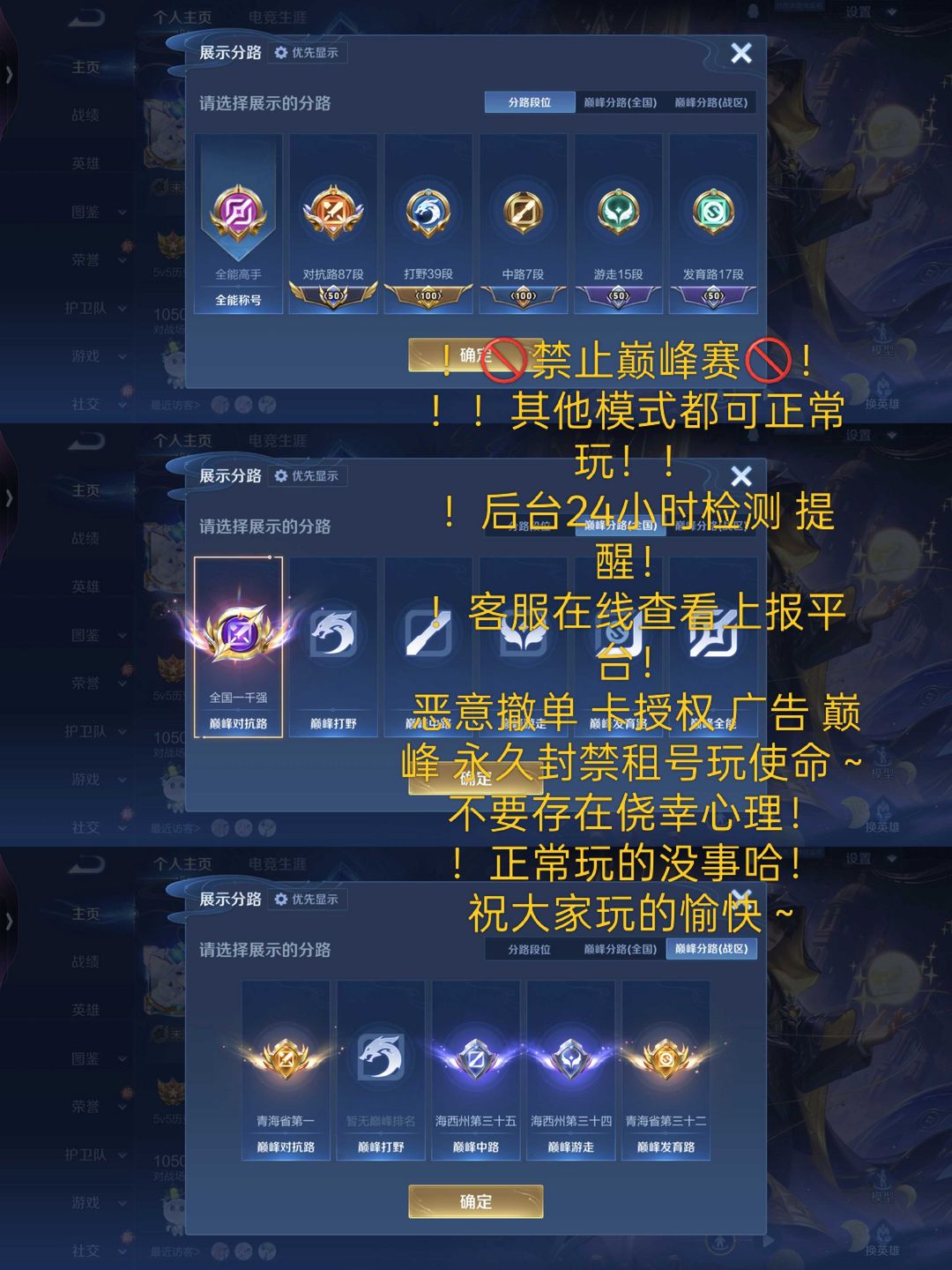 限制: 租号3次及以上 | 撤单率<65%才可租用此帐号装备描述:店铺内大多数号均可低价包天喔 本周截图❤️ 恶意挂机撤单永久拉黑平台记录 禁止巅峰赛●[挂机的的直接永久拉黑] [恶意撤单 乱撤单的直接拉黑]租客须知[订单结束后 下线后再次.上号的租客店铺自动拉黑。喜欢号麻烦各位续租或者重新下单] [恶意撤单 不说明合理理由的同样拉黑] [恶意挂机送人头全部余额并拉黑] [未满18岁禁止下单支持国家就完事了] [合伙人, 账号已在北京市gaj备案属私人财产恶意游戏行为导致封号将委托律师事务所起诉赔偿] [不良 游戏行为会.上报平台经理处理][更多优质账号收藏店铺挑选定时发红包] ★开挂或者第三方软件导致封号将会平台申诉封其租号玩账号并追究其法律责任 ★恶意撤秒改密码顶号拉黑并申诉追回租金 喜欢此账号租号玩平台直接租赁即可 ●以下违规情况扣除保证金①该账号禁止改名 ②违规导致扣信誉积分③非法发言导致账号禁言④聊天记录出现诈骗记录⑤1500分以下的禁止巅峰赛 打巅峰拉黑 营地~第三方软件将24小时通过后台监控!