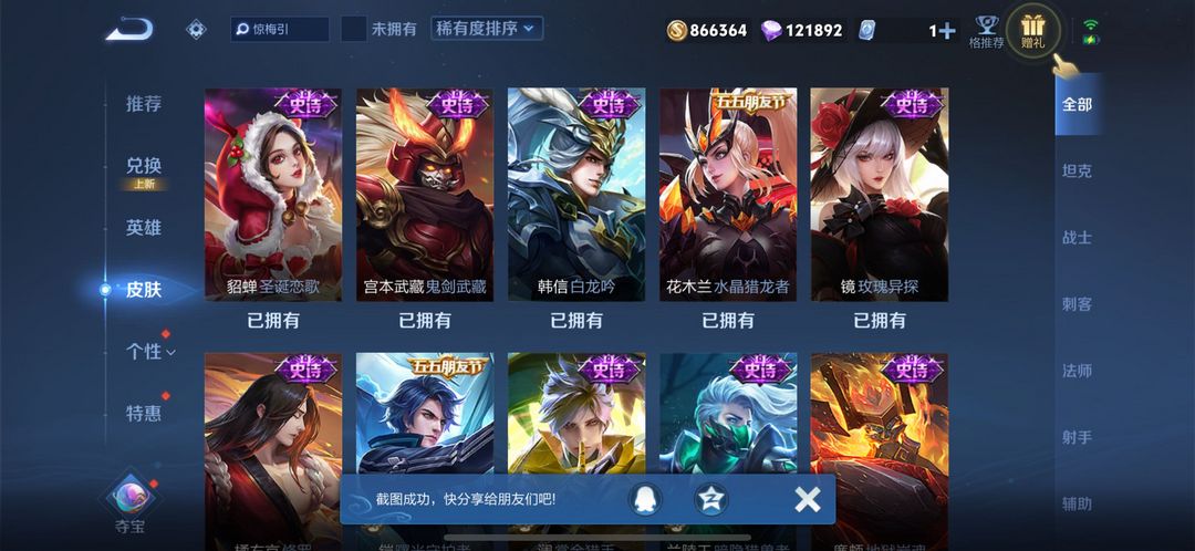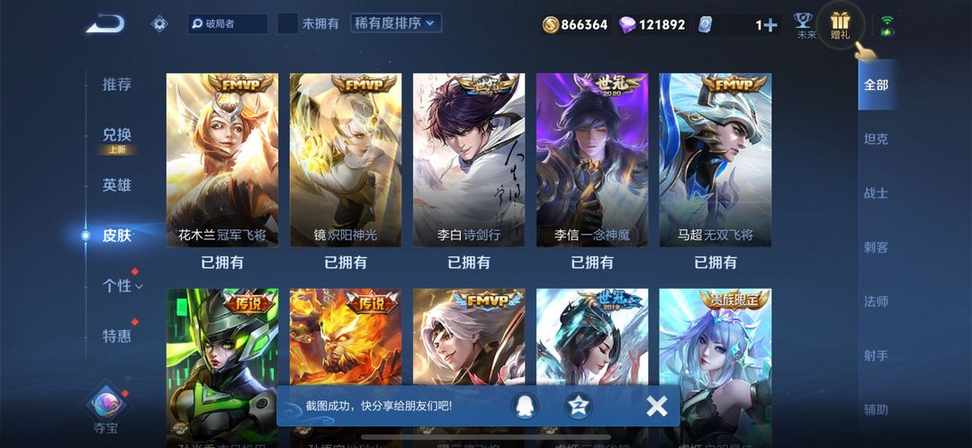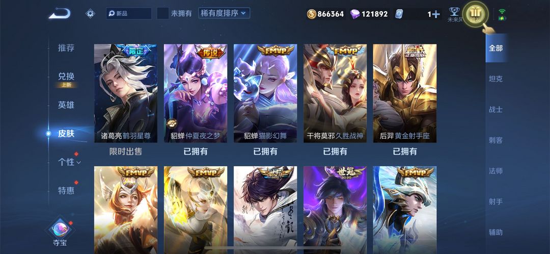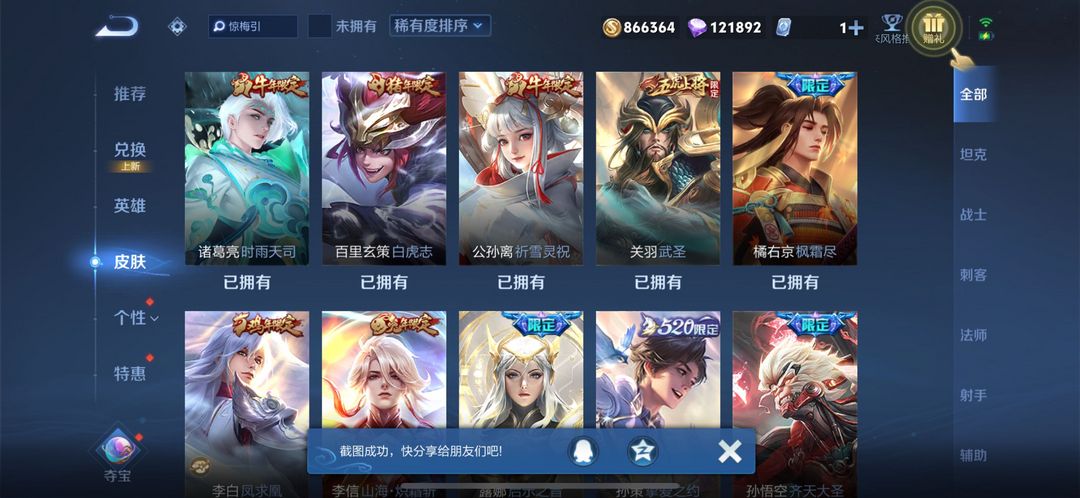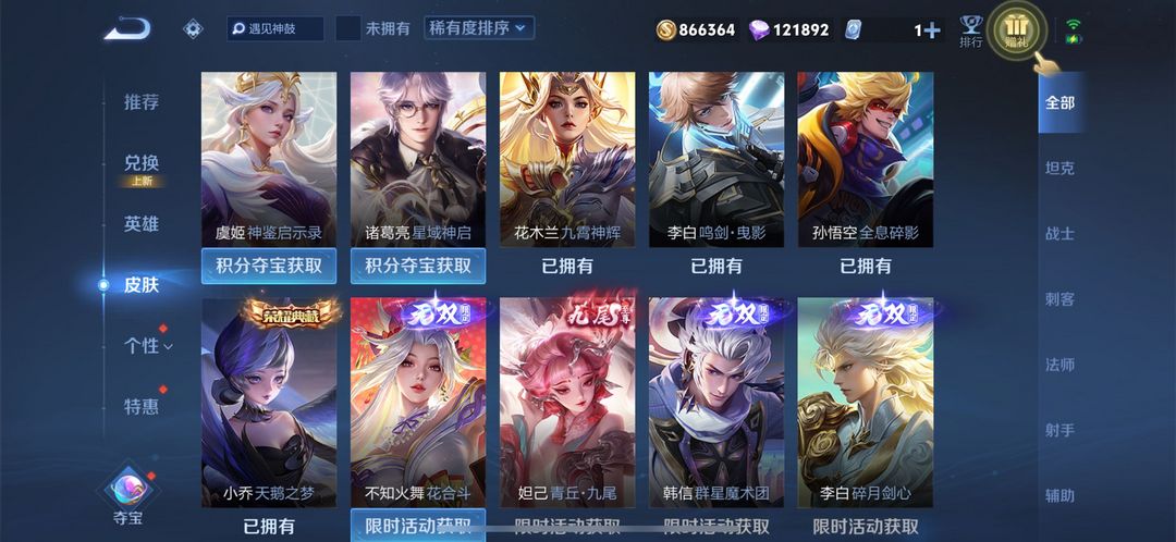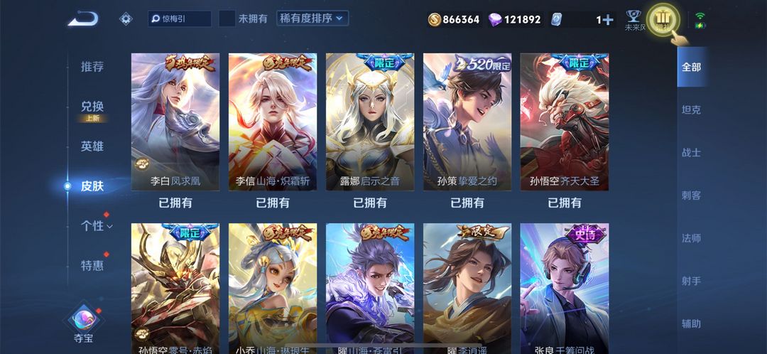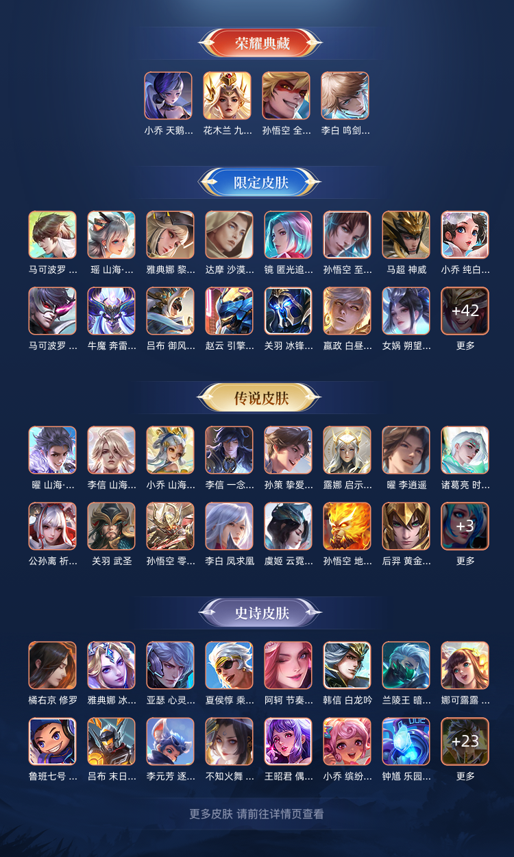 4个荣耀典藏 至尊宝打野主号 全是打野皮肤 也有其他的