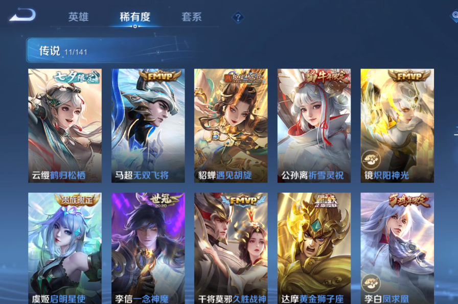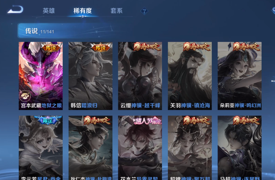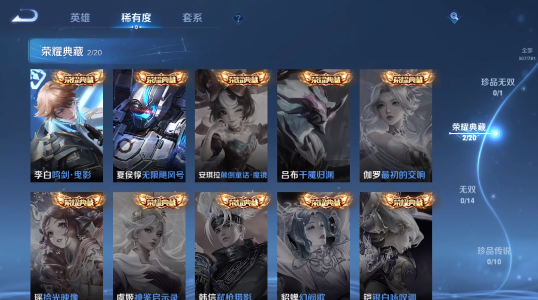 装备描述:贵族等级: V7 皮肤数: 307 荣耀水晶: 无限飓风号,鸣剑·曳影 星传说: 幽冥之眼 传说皮: 黄金狮子座,久胜战神,炽阳神光,一念神魔,地狱之眼,遇见胡旋,无双飞将,鹤归松栖(云缨) 限定皮: 遇见飞天,李小龙,祈雪灵祝,游园惊梦,梁祝,御风骁将,岱宗,天狼溯光者,飞衡,天狼征服者,凤求凰,如梦令-嫦娥,如梦令-后羿,大圣娶亲,高山流水,猪悟能,五谷丰年