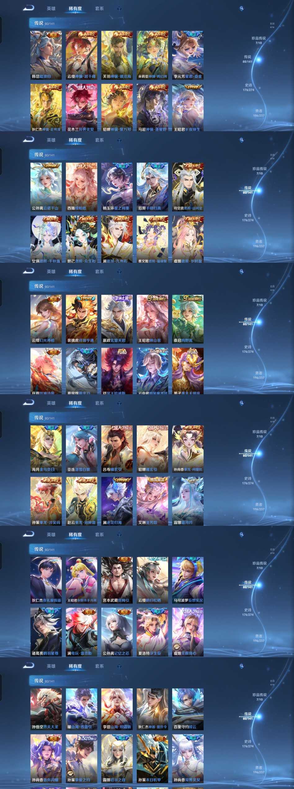 限制: 租号2次及以上 | 撤单率<49%才可租用此帐号装备描述:时间到了还登录白玩或者顶号全部改密拉黑处理永不解除,顶号机器会秒禁玩改密,顶号不仅拉黑还没得玩,赚三两块不容易,请理解谢谢。 ❤❤❤❤❤❤❤❤❤❤❤❤❤❤❤❤❤❤❤ 请勿开挂,挂机,送头,骂人,撤单后游戏等如有违规永久拉黑永不解除。 重置二级密码不要费劲了,号主每天都会上号查看,多行不义必自毙,人在做天在看,多做好事多自律,少做缺德事。 该号英雄129个皮肤548个,珍品无双1个,典藏6个,无双4个,珍品传说7个,星传说3个,传说80个,史诗176个,祝您游戏愉快~