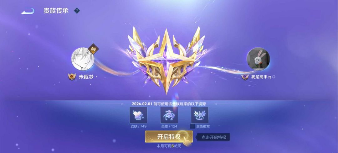 限制: 租号5次及以上 | 撤单率<50%才可租用此帐号装备描述:750皮荣耀贵族传承号,上号需要自己手动开启传承共享大号皮肤,,大号缺s345赛季皮肤满星传说