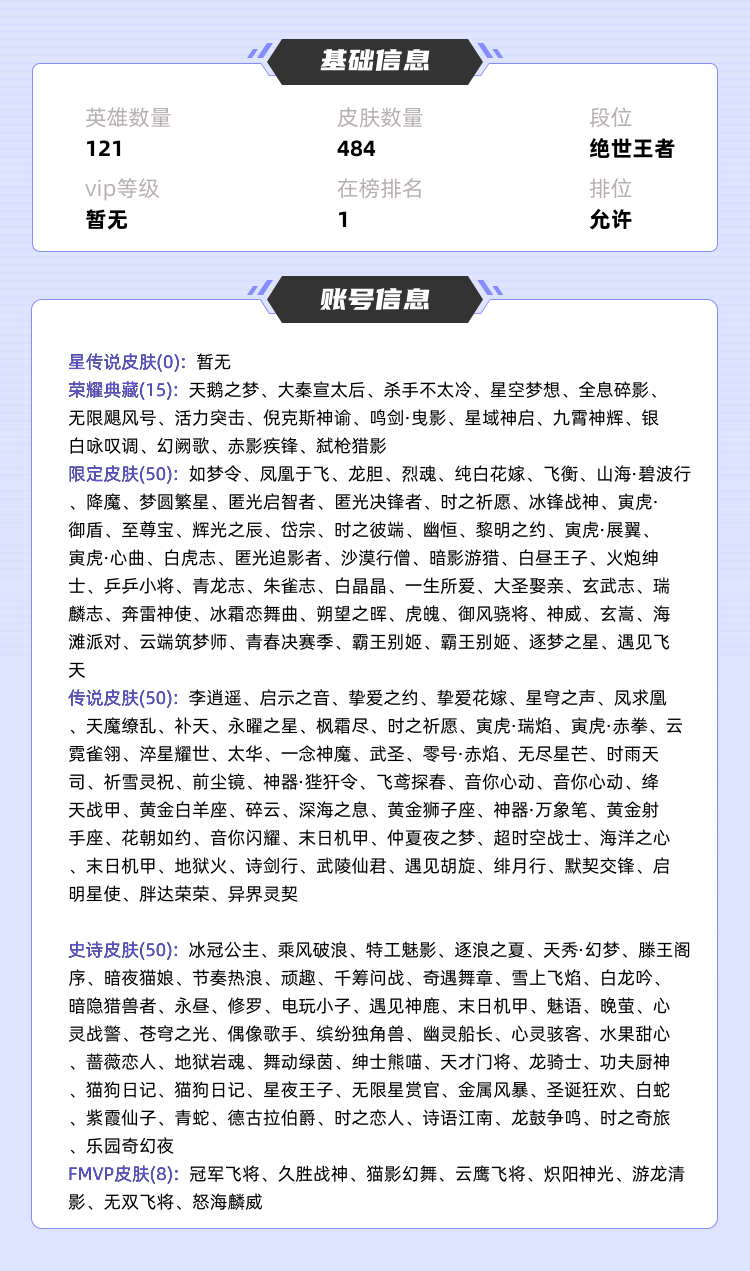 装备描述:>>>>>>毁号,涉及毁坏虚拟财产罪及计算机安全罪,请文明游戏素质游戏,让我们共建美好租号平台>>>>>> 本游戏账号: ,基础段位:绝世王者,英雄多,皮肤多。典藏皮肤15个,感受典藏皮肤带来的优质体验快感,FMVP皮肤8个,尽情享受FMVP皮肤带来的主角光环, 私人所属英雄皮肤有:孙尚香 杀手不太冷||韩信 弑枪猎影||武则天 倪克斯神谕||孙悟空 全息碎影||关羽 赤影疾锋||貂蝉 幻阙歌||小乔 天鹅之梦||花木兰 九霄神辉||李白 鸣剑·曳影||诸葛亮 星域神启||夏侯惇 无限飓风号||铠 银白咏叹调||芈月 大秦宣太后||鲁班七号 星空梦想||程咬金 活力突击,等等 注意事项: A.游戏过程中请不要恶意挂机或者不文明发言;B.恶意挂机、顶号等行为将被拉黑无法再次下单;C.进入游戏后中途请勿退出登陆,否则无法再次上号;D.部分账号由于异地登录可能会出现密码错误提示,通常再尝试5-6次后可上号。 |||||||||>喜欢本账号请点 ☆收藏☆ 方便下次租用,谢谢光临惠顾|||||||||