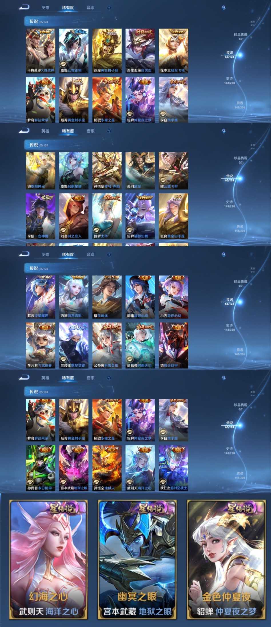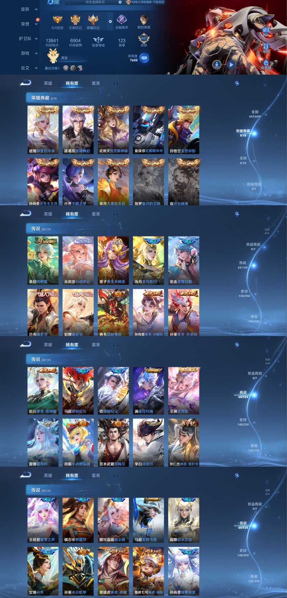 限制: 撤单率<49%才可租用此帐号装备描述:时间到了还登录白玩或者顶号全部改密拉黑处理永不解除,顶号机器会秒禁玩改密,顶号不仅拉黑还没得玩,赚三两块不容易,请理解谢谢。 ❤❤❤❤❤❤❤❤❤❤❤❤❤❤❤ 请勿开挂,挂机,送头,骂人,撤单后游戏等如有违规永久拉黑永不解除。 重置二级密码不要费劲了,号主每天都会上号查看,多行不义必自毙,人在做天在看,多做好事多自律,少做缺德事。 该号英雄123个皮肤464个,典藏9个,星传说3个,传说65个,史诗148个,祝你游戏愉快~