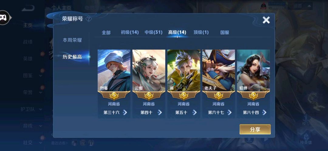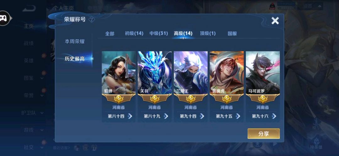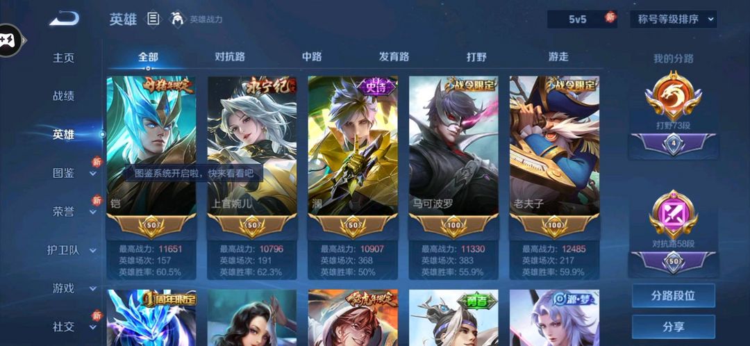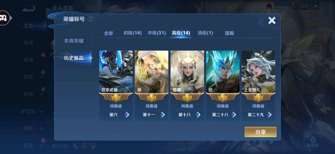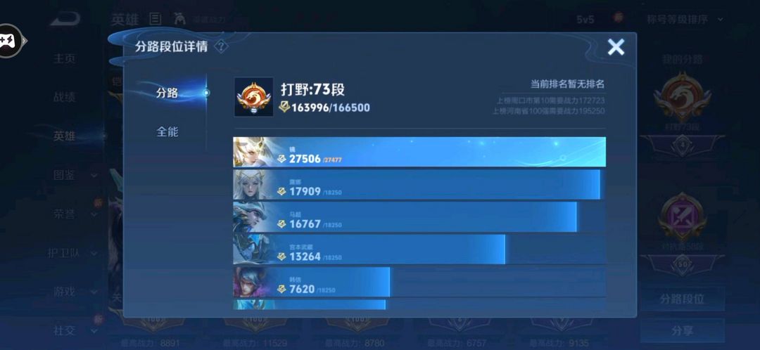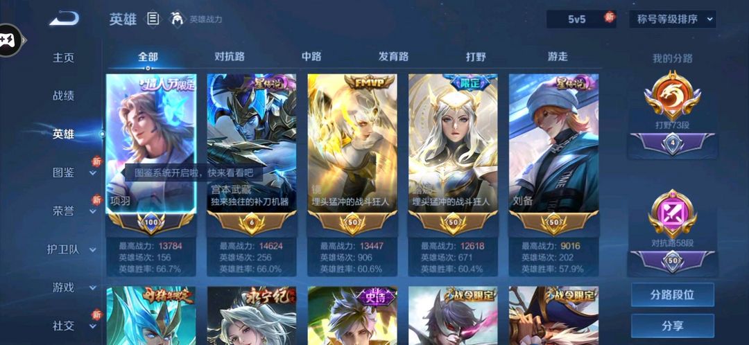 73段打野历史小国标项羽国服/14金标/金标万战宫本/镜/露娜/澜/婉儿/铠/58段对抗禁巅峰