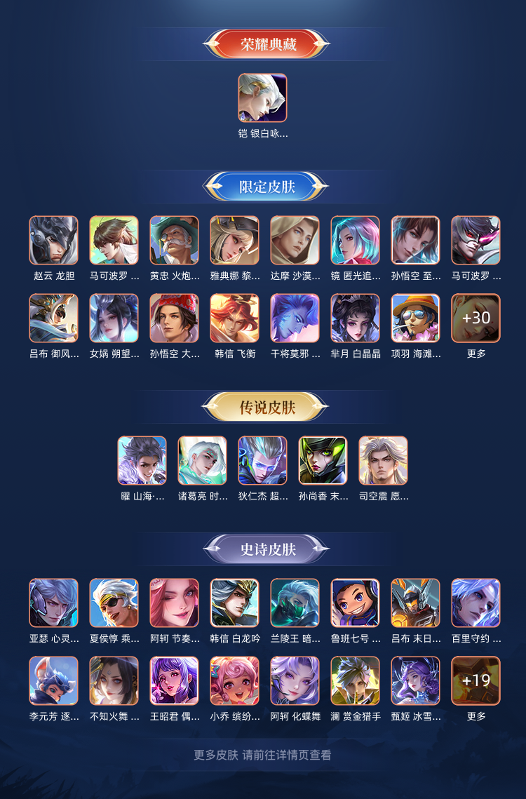 限制: 租号3次及以上 |装备描述:>>>>>>毁号,涉及毁坏虚拟财产罪及计算机安全罪,请文明游戏素质游戏,让我们共建美好租号平台>>>>>> 本游戏账号:V8用户,基础段位:永恒钻石V,英雄多,皮肤多。典藏皮肤11个,感受典藏皮肤带来的优质体验快感,FMVP皮肤9个,尽情享受FMVP皮肤带来的主角光环, 私人所属英雄皮肤有:诸葛亮 星域神启||铠 银白咏叹调||孙尚香 杀手不太冷||鲁班七号 星空梦想||李白 鸣剑·曳影||武则天 倪克斯神谕||关羽 赤影疾锋||貂蝉 幻阙歌||花木兰 九霄神辉||孙悟空 全息碎影||小乔 天鹅之梦,等等 注意事项: A.游戏过程中请不要恶意挂机或者不文明发言;B.恶意挂机、顶号等行为将被拉黑无法再次下单;C.进入游戏后中途请勿退出登陆,否则无法再次上号;D.部分账号由于异地登录可能会出现密码错误提示,通常再尝试5-6次后可上号。 |||||||||>喜欢本账号请点 ☆收藏☆ 方便下次租用,谢谢光临惠顾|||||||||