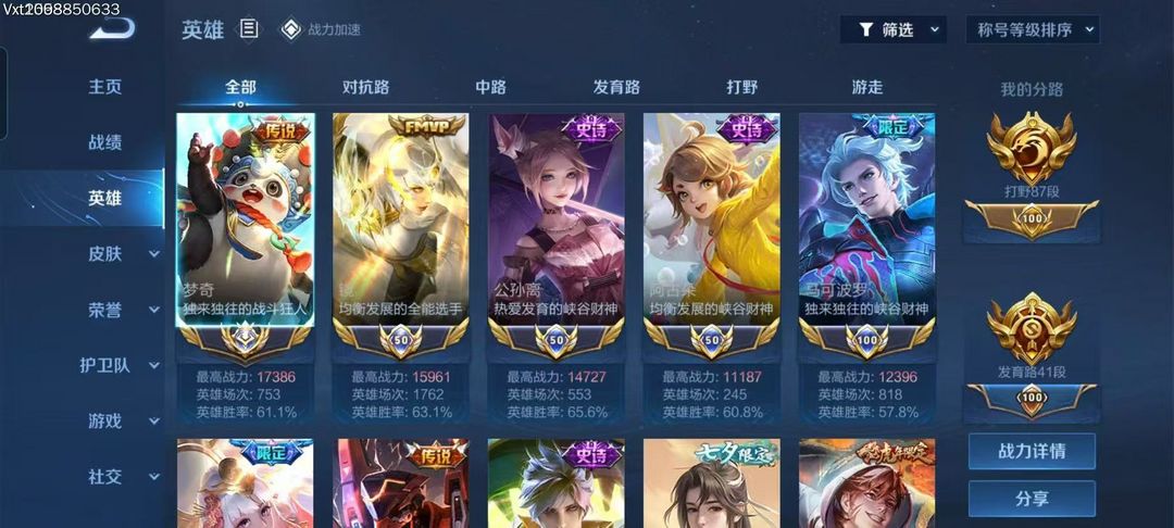 秒上号!90段打野1大国梦琪6小国镜阿里马克露露凯343质量皮♥开黑必备♥可巅峰可排位!