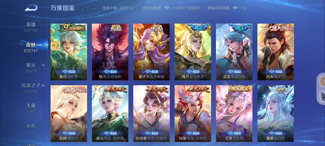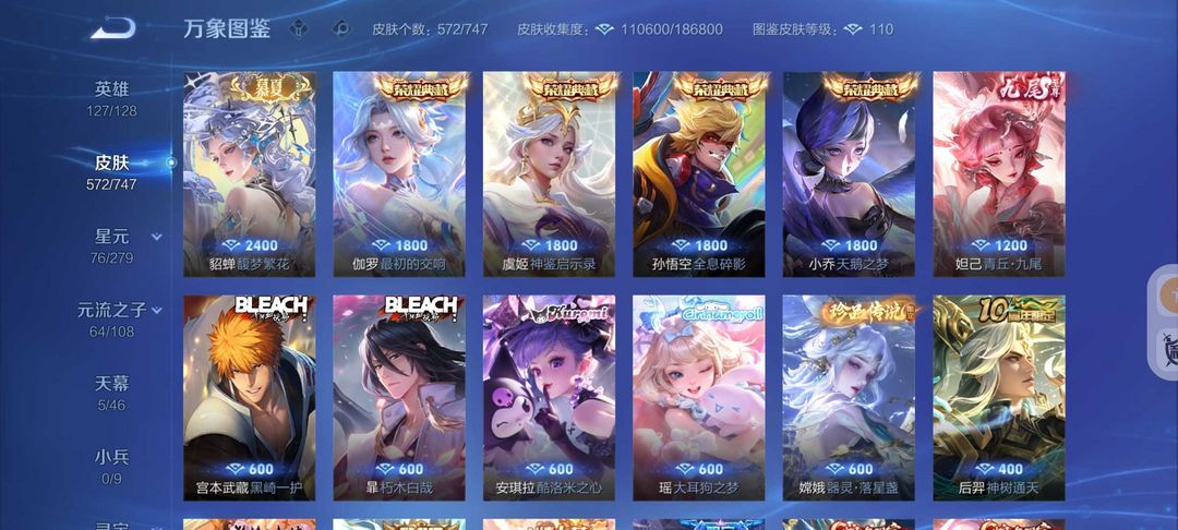 装备描述:572皮肤❤️貂蝉慕夏❤️新珍品宫本暃❤️86传说皮❤️满蛇年❤️千山共赴❤️