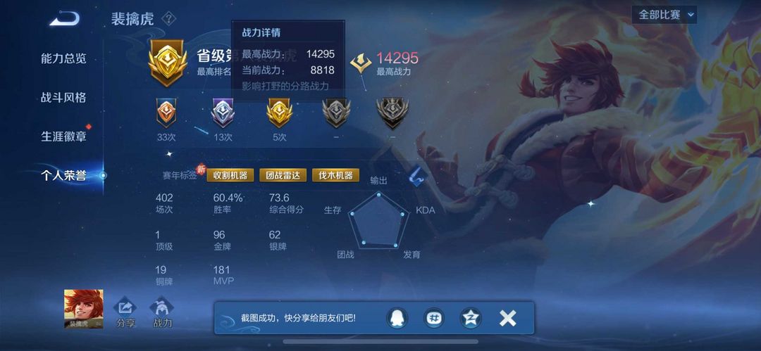 装备描述:毁号,涉及毁坏虚拟财产罪及计算机安全罪,请文明游戏素质游戏,让我们共建美好租号平台 本游戏账号: 英雄多皮肤多。FMVP皮肤1个尽情享受FMVP皮肤带来的主角光环 私人所属英雄皮肤有:宫本武藏 地狱之眼李白 凤求凰李白 诗剑行赵云 淬星耀世曜 李逍遥露娜 启示之音露娜 霜月吟裴擒虎 寅虎·赤拳镜 炽阳神光等等 注意事项: A.游戏过程中请不要恶意挂机或者不文明发言B.恶意挂机、顶号等行为将被拉黑无法再次下单C.进入游戏后中途请勿退出登陆,否则无法再次上号D.部分账号由于异地登录可能会出现密码错误提示,通常再尝试5-6次后可上号。 喜欢本账号请点 ☆收藏☆ 方便下次租用,谢谢光临惠顾
