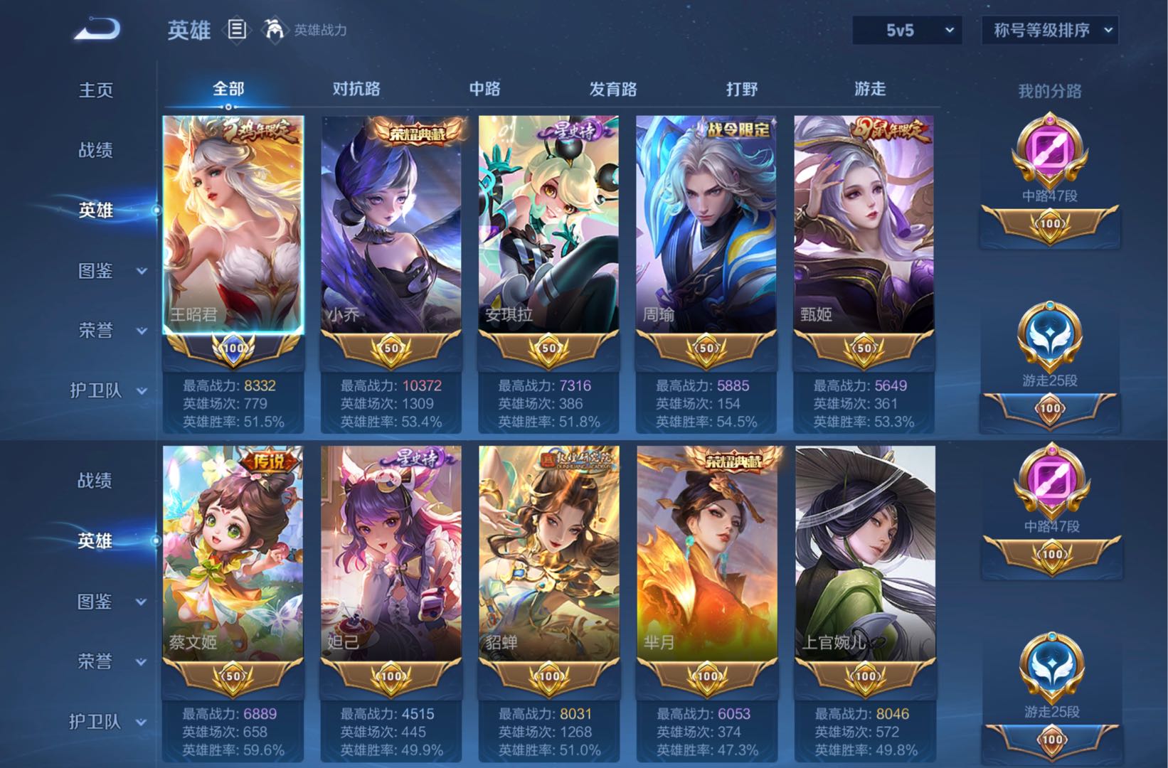 紫瑶✨历史小国王昭君 九金标 47段中路万战小乔✨天鹅✨太后✨星空✨神威✨补天✨异界灵契