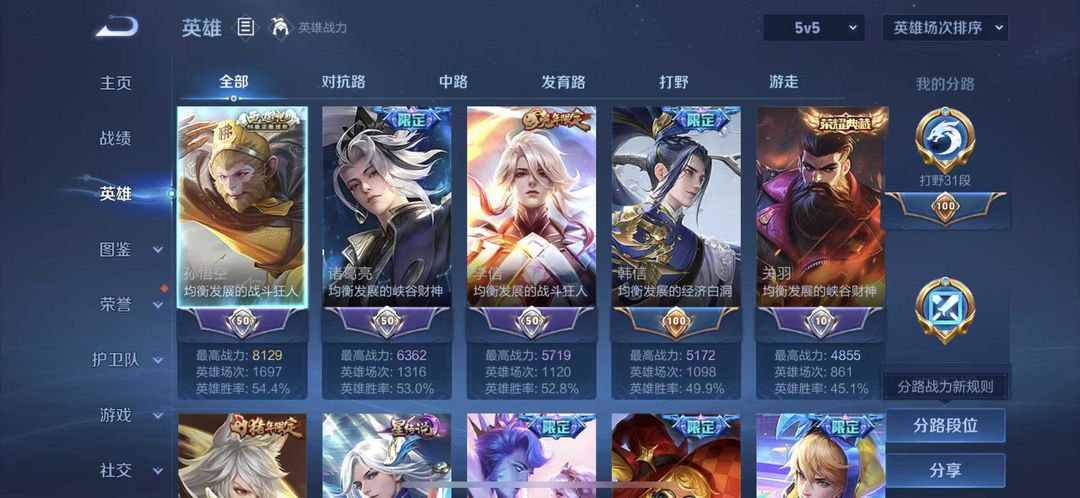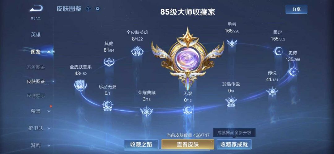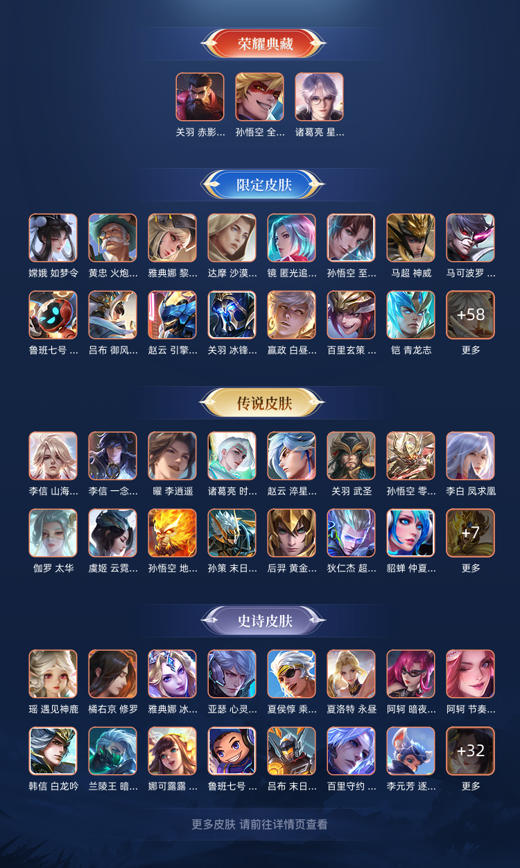 装备描述:V10 英雄数: 125 皮肤数: 408 荣耀水晶: 鸣剑·曳影,全息碎影,星域神启,弑枪猎影 传说皮: 黄金狮子座,黄金射手座,云鹰飞将,绛天战甲,猫影幻舞,久胜战神,炽阳神光,一念神魔,云霓雀翎,末日机甲-孙尚香,地狱火,仲夏夜之梦,地狱之眼,胖达荣荣,乞巧织情,时之恋人-刘备,淬星耀世,超时空战士-狄仁杰,遇见胡旋,艾琳觅芳踪 限定皮: 冰锋战神,遇见飞天,李小龙,梁祝,御风骁将,烈魂,天狼溯光者,天狼狩猎者,冰霜恋舞曲,逐梦之星,逐梦之光,天狼绘梦者,凤求凰,青龙志,玄武志,朱雀志,至尊宝,一生所爱,大圣娶亲,高山流水,孙行者,猪悟能,匿光追影者,傲雪梅枪,五谷丰年,山海·玄木吟