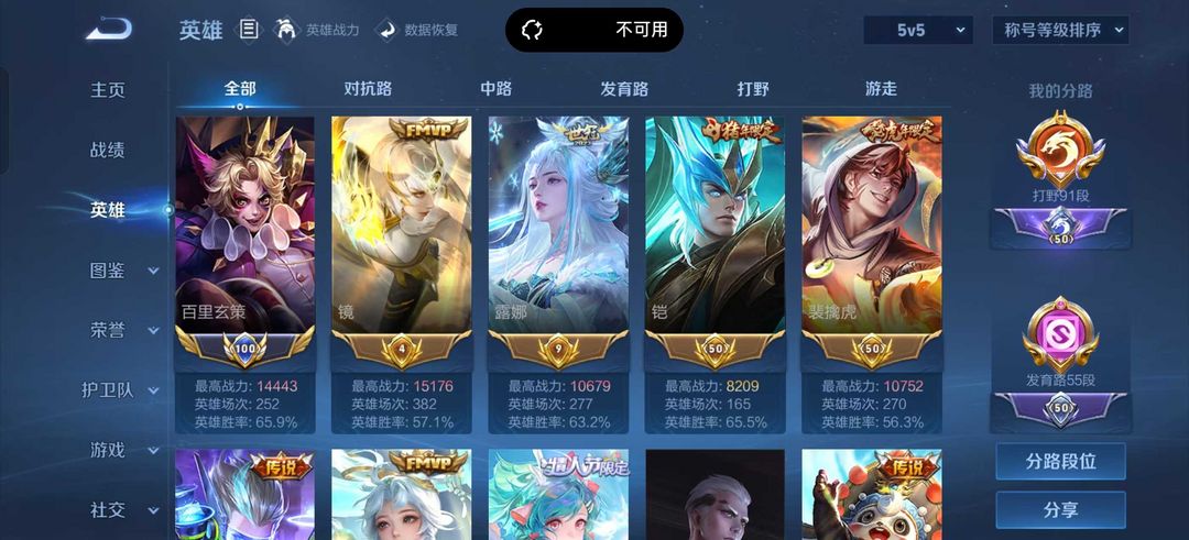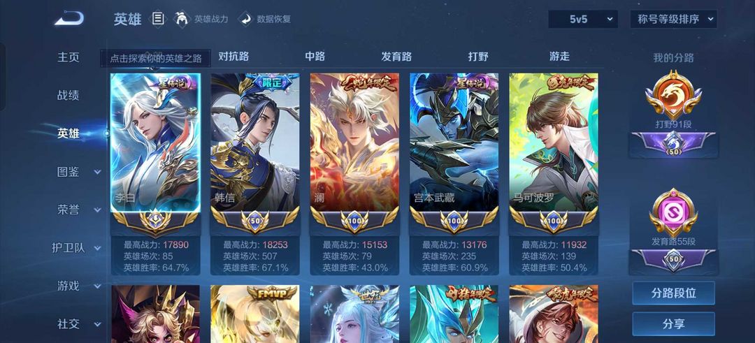 历史91段打野1.8w大国标李白 1.8w韩信 国服澜 国服宫本 国服马可 国服玄策 N个高战力省标
