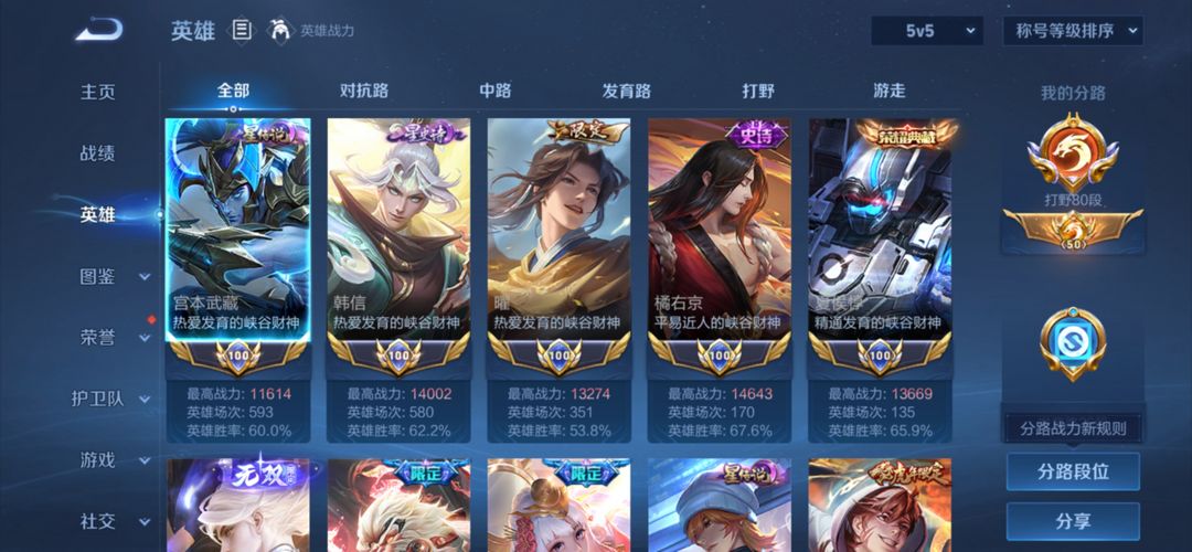 打野80段野王❤小国标韩信曜橘右京宫本夏侯惇❤满珍品❤6水5无双