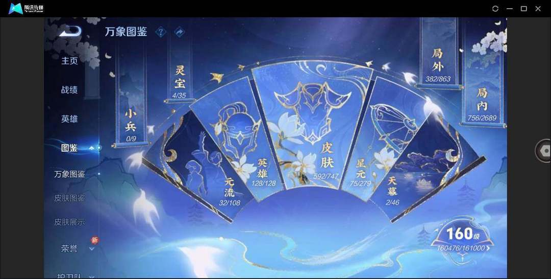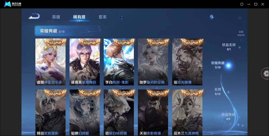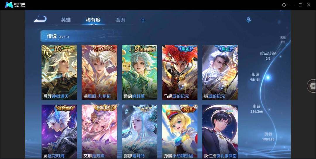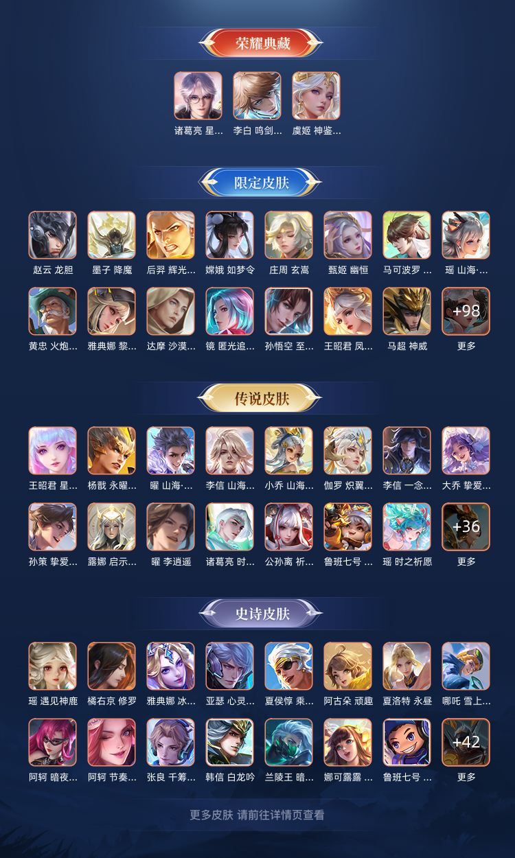 装备描述:荣耀水晶(4) 武则天,鸣剑·曳影,星域神启,神鉴启示录 无双皮(5) 真我赫兹(瑶),神器·明辉仪,青丘·九尾,碎月剑心,器灵·螭龙剑 星传说(8) 时之愿境,幻海之心,未来机甲,幽冥之眼,零号·雷霆,金色仲夏夜,无限倾慕,玉鸾吟 传说皮(68) 黄金狮子座,黄金射手座,冠军飞将,云鹰飞将,绛天战甲,黄金白羊座,猫影幻舞,久胜战神,炽阳神光,一念神魔,云霓雀翎,末日机甲-孙尚香,地狱火,仲夏夜之梦,音你心动-小乔,零号·赤焰,海洋之心,地狱之眼,飞鸢探春,音你心动-周瑜,胖达荣荣,李逍遥,乞巧织情,时之恋人-刘备,游龙清影,淬星耀世,超时空战士-狄仁杰,遇见胡旋,末日机甲-孙策,花朝如约,挚爱之约,挚爱花嫁,无双飞将,音你闪耀,碎云,神器·狴犴令,神器·明辉仪,山海·炽霜斩,山海·琳琅生,山海·苍雷引,炽翼辉光,燃星之曲,画中仙,浮生妄,记忆之芯,百相守梦(张飞),追逃游戏(亚瑟),追逃游戏(安琪拉),电玩·雷克斯,鹤羽星尊,灼幽烈阳,妄想实况,妄想奇谈,鹤归松栖(云缨),惊梅引,遇见神鼓,鲁班七号-时之奇旅,大乔-时之奇旅,永恒水手月亮,夜礼服假面,小动物乐团,霜月吟,澜逐花归海,
