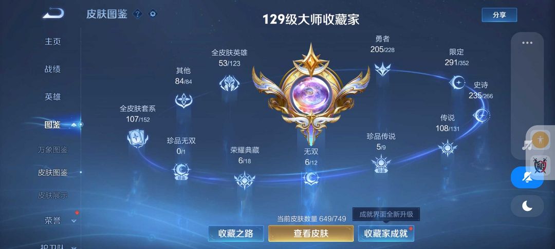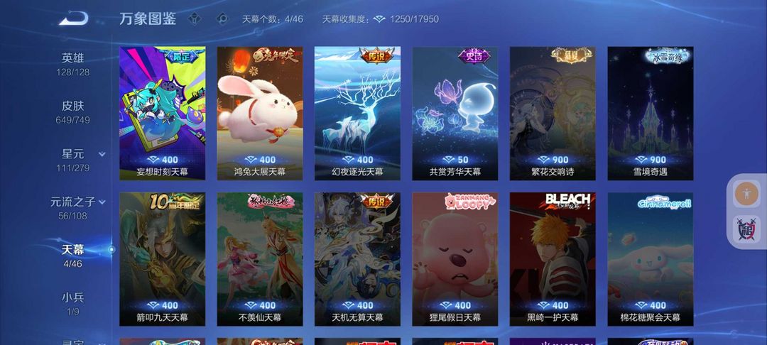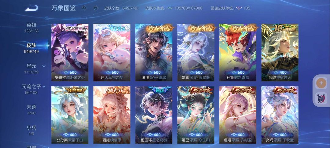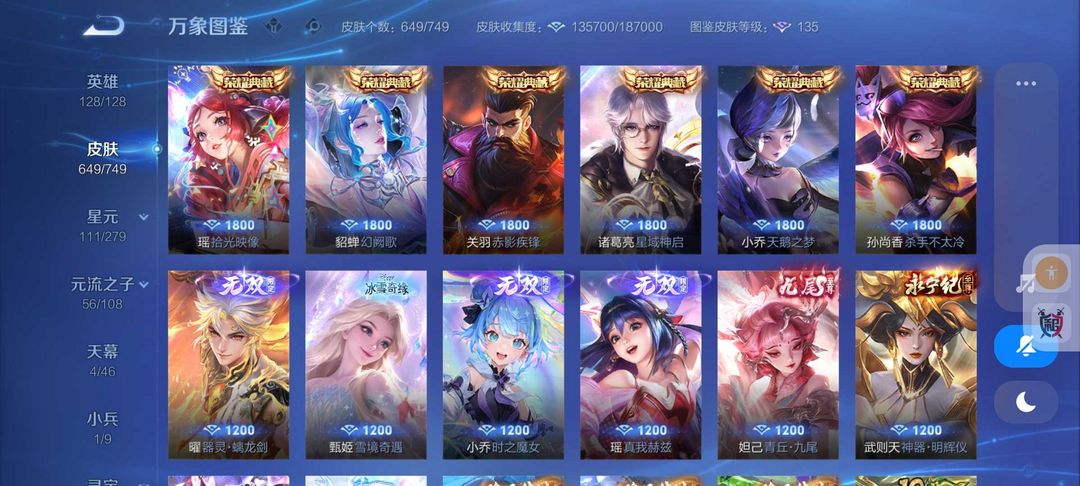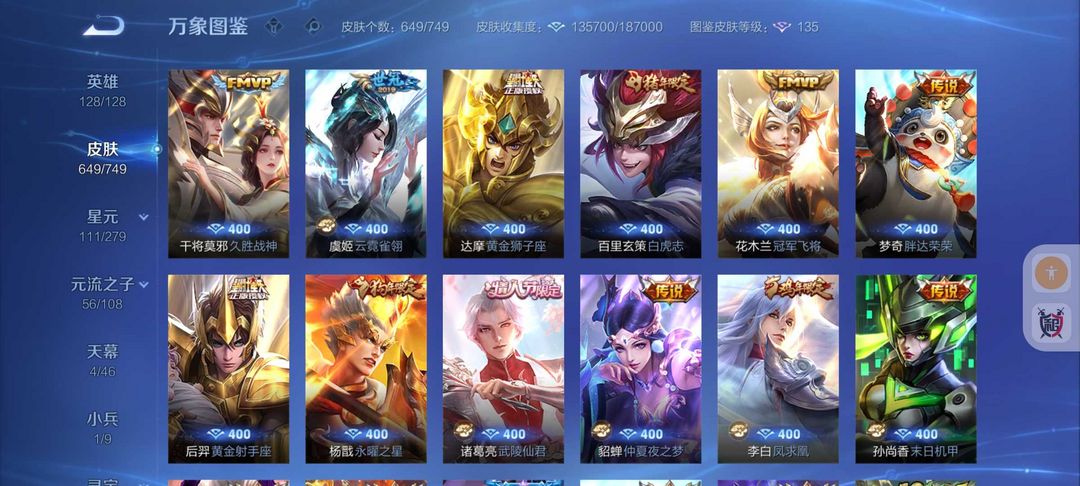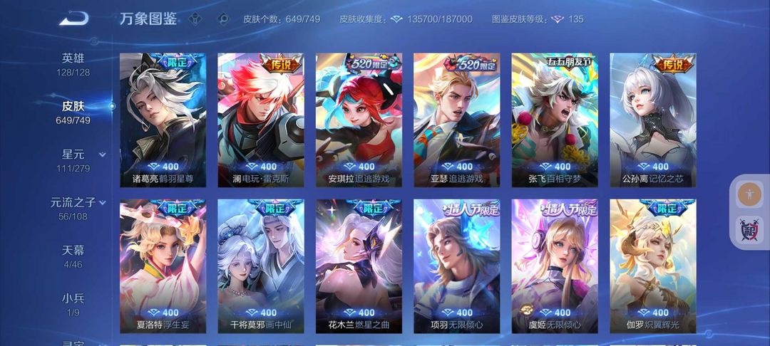 装备描述:649皮肤❤8典藏6无双皮❤大耳狗库洛米❤108传说皮满蛇年限定皮9星传说❤冰雪小兵皮❤