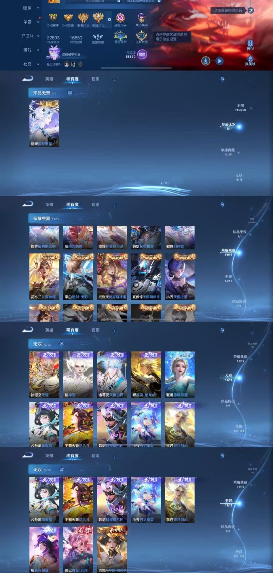 限制: 租号2次及以上 | 撤单率<49%才可租用此帐号装备描述:时间到了还登录白玩或者顶号全部改密拉黑处理永不解除,顶号机器会秒禁玩改密,顶号不仅拉黑还没得玩,赚三两块不容易,请理解谢谢。 ❤❤❤❤❤❤❤❤❤❤❤❤❤❤❤❤❤❤❤ 请勿开挂,挂机,送头,骂人,撤单后游戏等如有违规永久拉黑永不解除。 重置二级密码不要费劲了,号主每天都会上号查看,多行不义必自毙,人在做天在看,多做好事多自律,少做缺德事。 该号英雄129个皮肤745个,珍品无双1个,典藏12个,无双13个,珍品传说9个,星传说14个,传说131个,史诗265个,祝您游戏愉快~