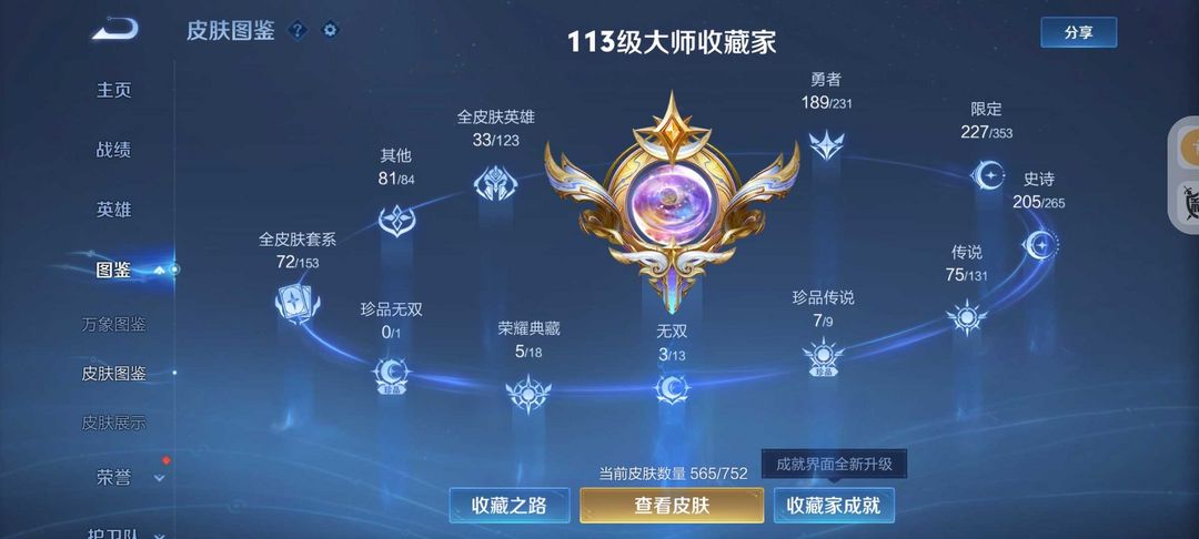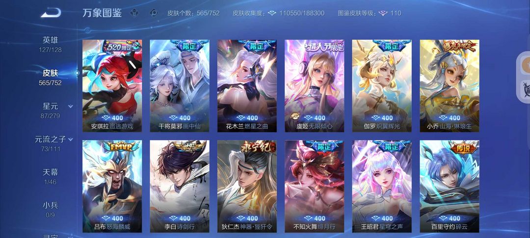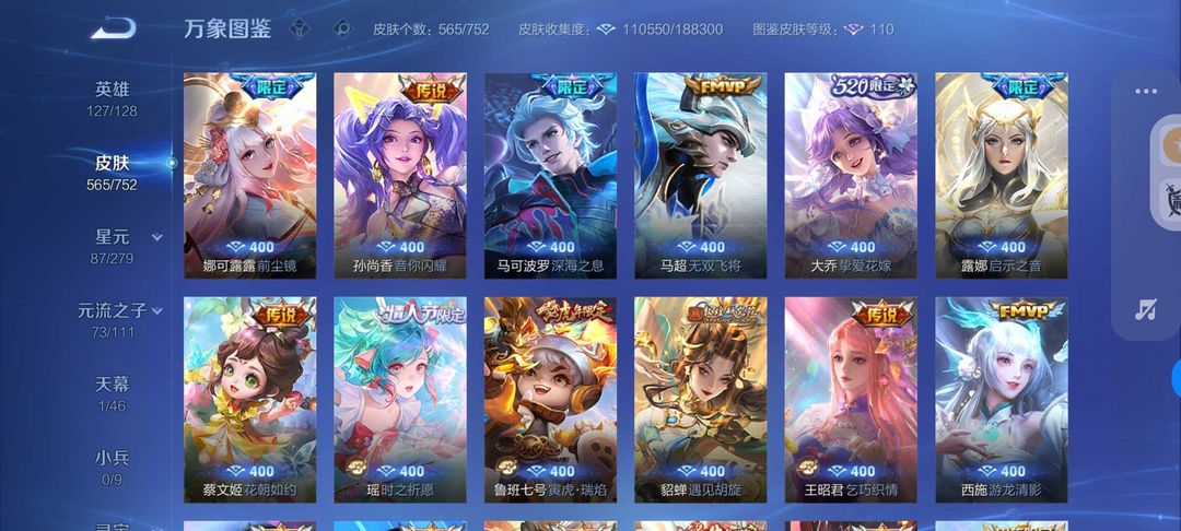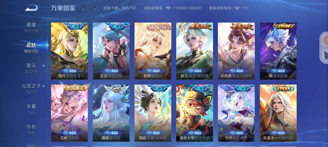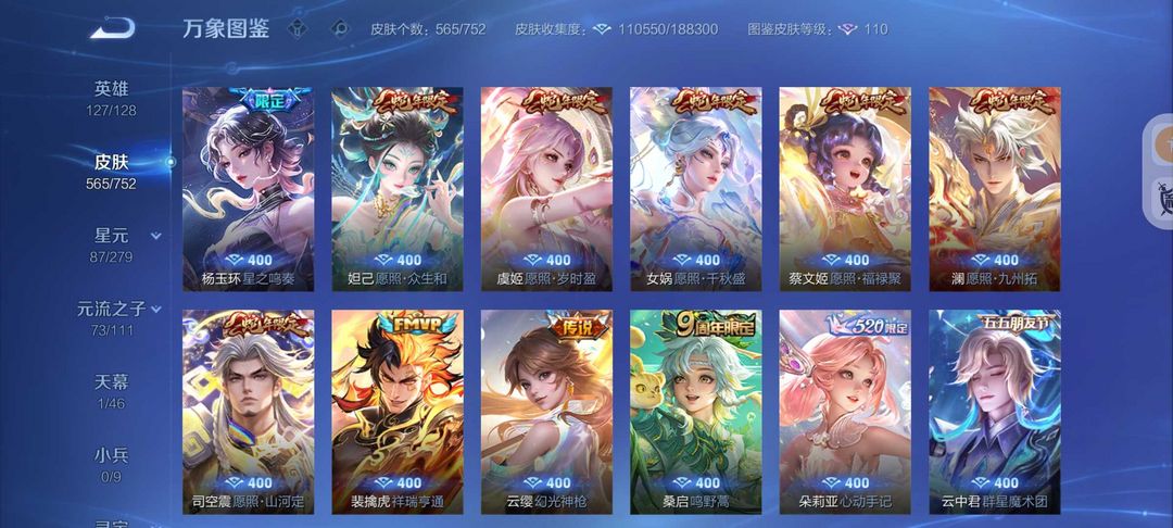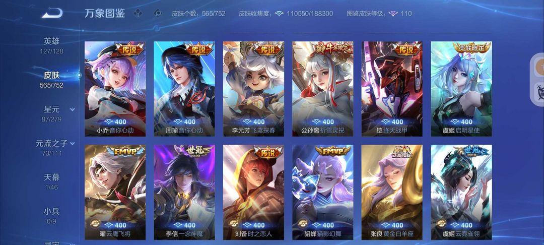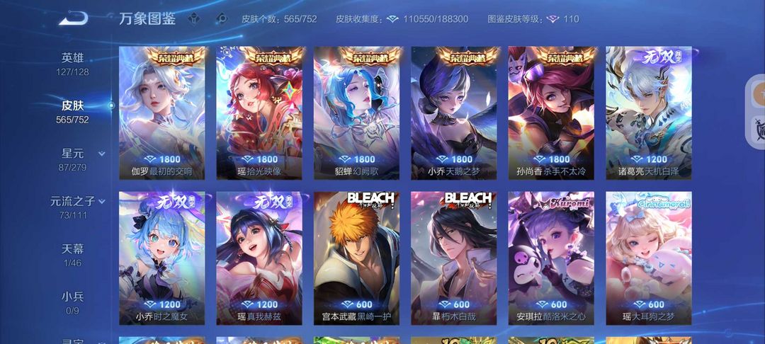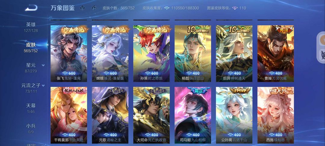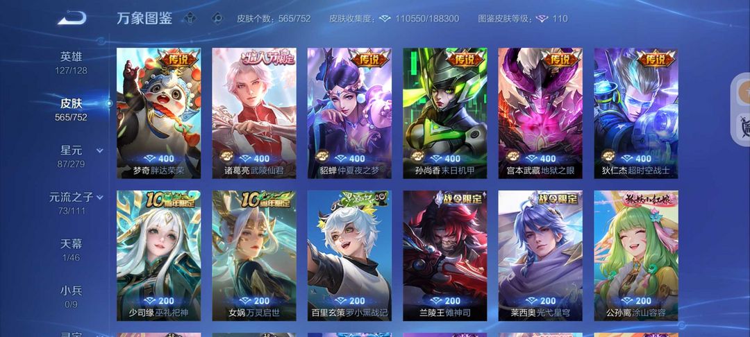 装备描述:无双V10号565皮肤6典藏3无双7珍品传说❤75传说皮❤天机白泽真我赫兹❤宫本暃新珍品❤诡秘之主满蛇年FMVP