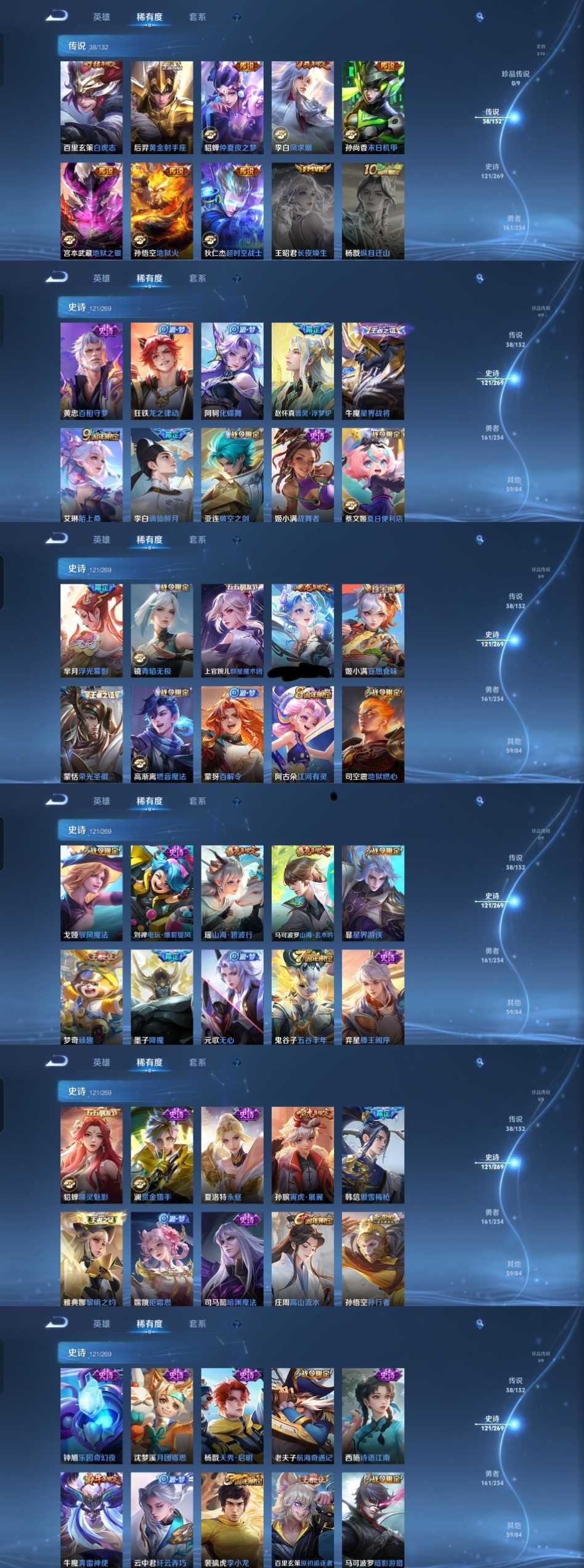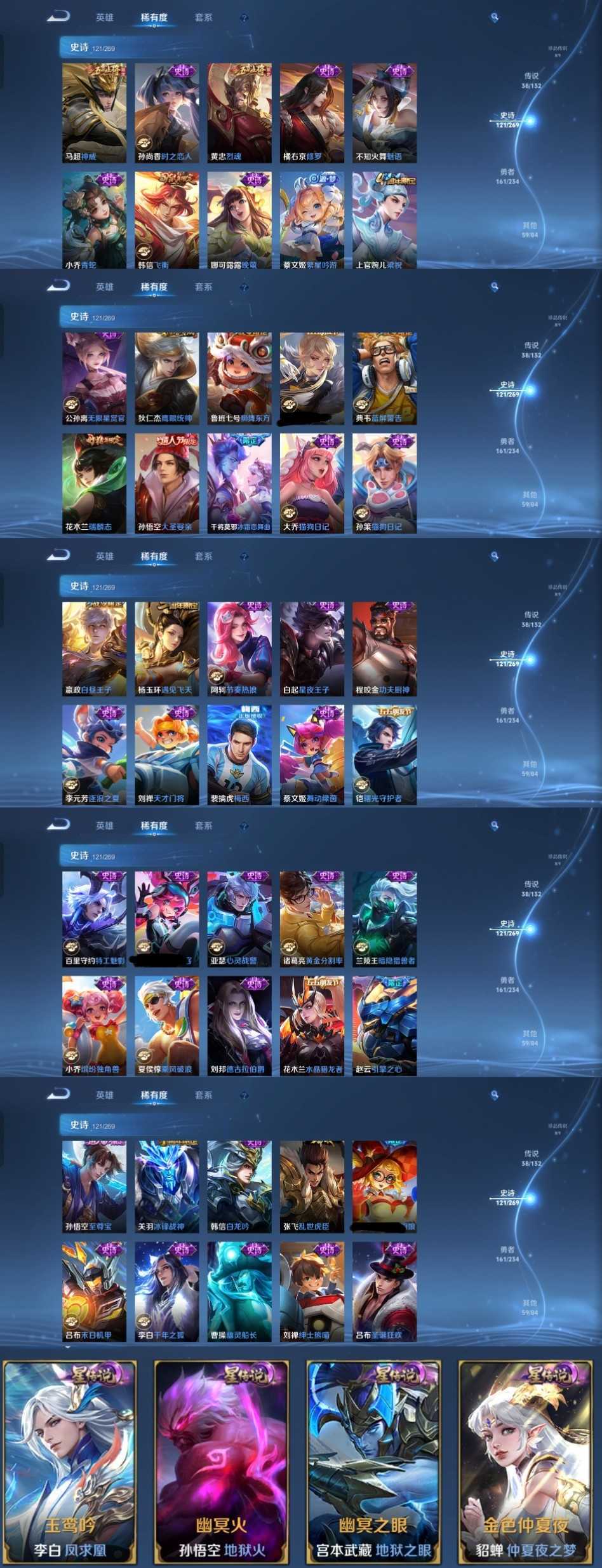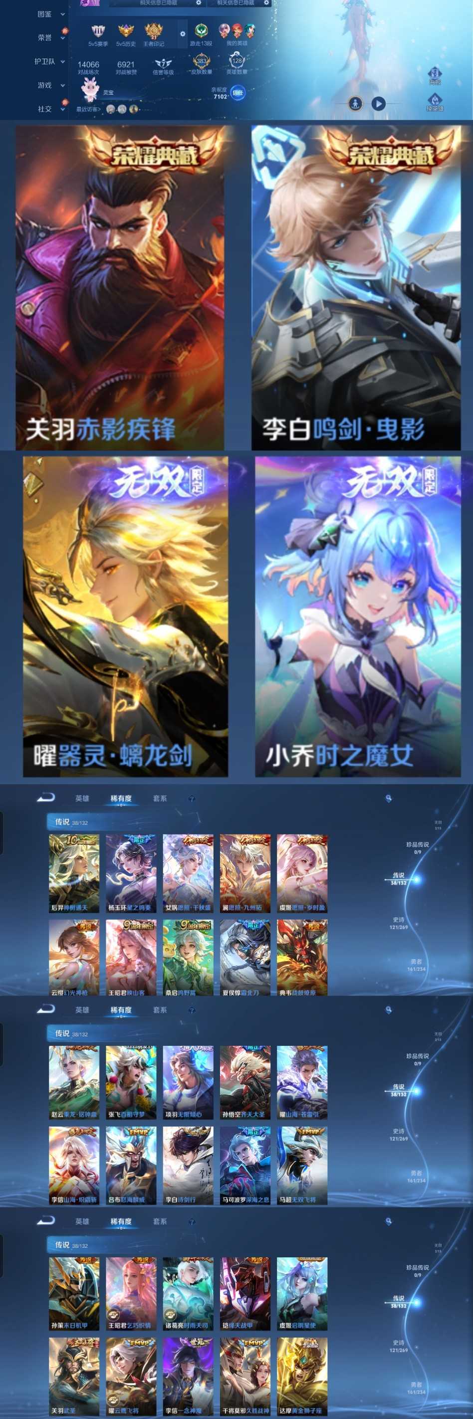 限制: 租号1次及以上 | 撤单率<49%才可租用此帐号装备描述:时间到了还登录白玩或者顶号全部改密拉黑处理永不解除,顶号机器会秒禁玩改密,顶号不仅拉黑还没得玩,赚三两块不容易,请理解谢谢。 ❤❤❤❤❤❤❤❤❤❤❤❤❤❤❤❤❤❤❤ 请勿开挂,挂机,送头,骂人,撤单后游戏等如有违规永久拉黑永不解除。 重置二级密码不要费劲了,号主每天都会上号查看,多行不义必自毙,人在做天在看,多做好事多自律,少做缺德事。 该号英雄128个皮肤383个,典藏2个,无双2个,星传说4个,传说38个,史诗121个,祝您游戏愉快~